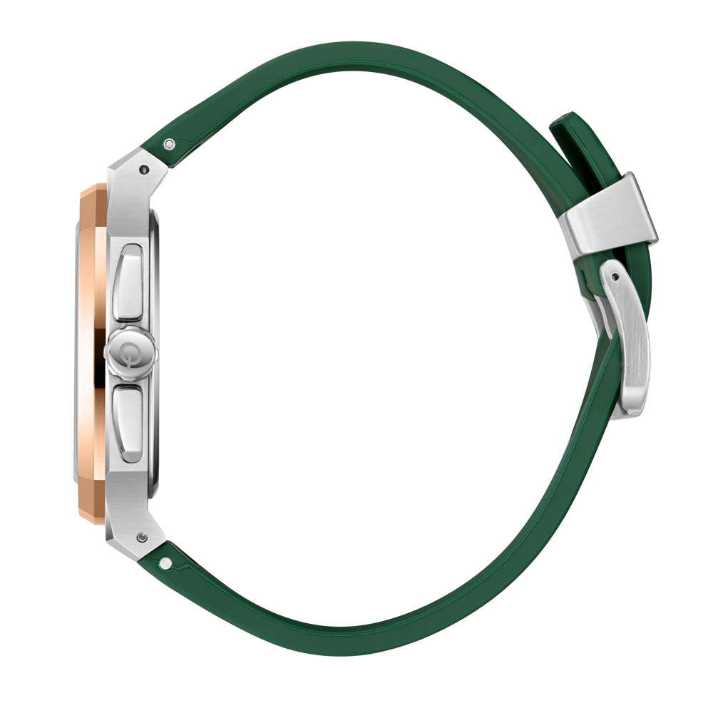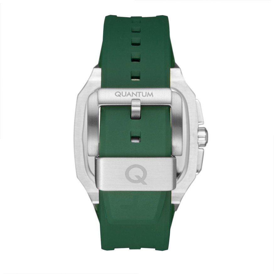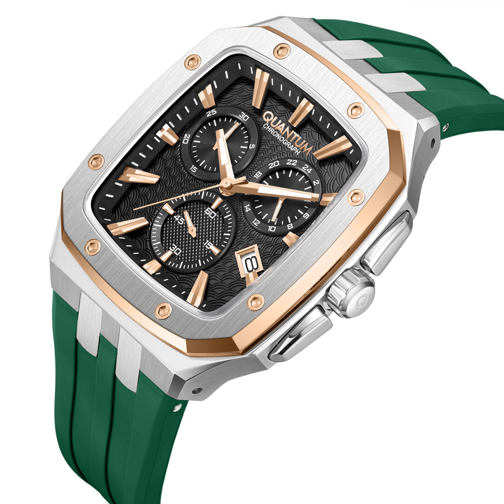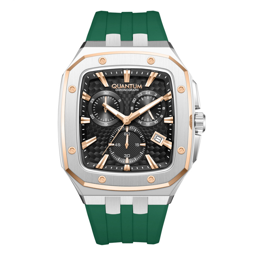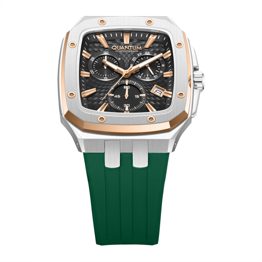 Мъжки часовник Quantum със спортно-ежедневен дизайн от колекцията Hunter. Черен дисплей хронограф с детайли в цвят розово злато. Луминесцентно покритие върху стрелките. Стъкло минерал-кристал с антирефлексно покритие. Корпус от неръждаема стомана в комбинация със силиконова каишка. Задвижва се от кварцов механизъм с калибър VR34A. Водоустойчивост 10 ATM - позволява мокрене, къпане и плуване във водни басейни.