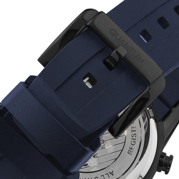 Мъжки часовник Quantum със спортен дизайн от колекцията Adrenaline. Син мултифункционален дисплей с детайли в цвят розово злато. Луминесцентно покритие върху стрелките. Стъкло минерал-кристал с антирефлексно покритие. Корпус  изработен от неръждаема стомана. Синя силиконова каишка. Задвижва се от кварцов механизъм с калибър VX9J. Водоустойчивост 10 ATM - позволява мокрене, къпане и плуване във водни басейни.