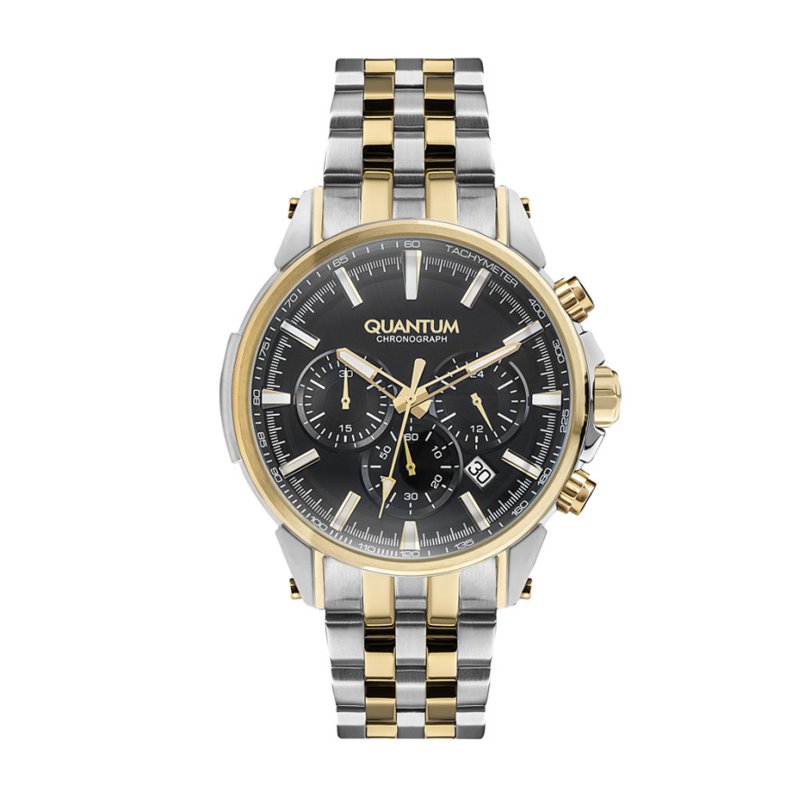 Мъжки часовник Quantum със спортно-елегантен дизайн от колекцията Powertech. Черен дисплей хронограф с детайли в цвят злато. Луминисцентно покритие на стрелките и индексите. Стъкло минерал-кристал с антирефлексно покритие. Корпус и верижка от неръждаема стомана. Часовникът се задвижва от кварцов механизъм. Водоустойчивост 10 ATM - позволява мокрене, къпане и плуване във водни басейни.