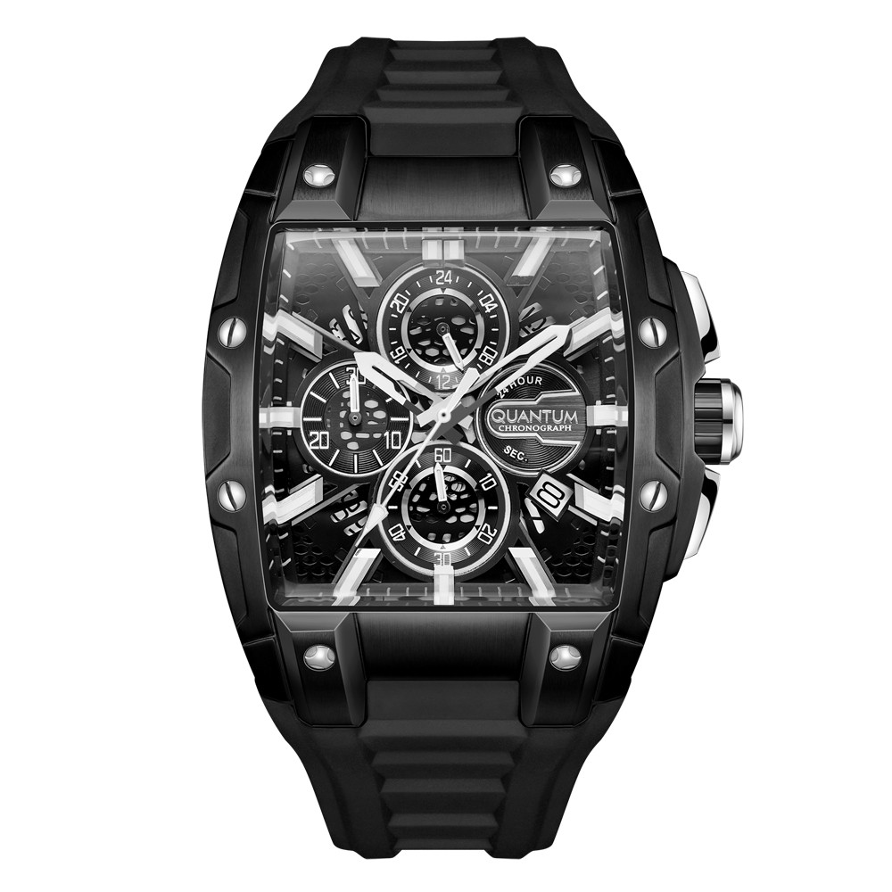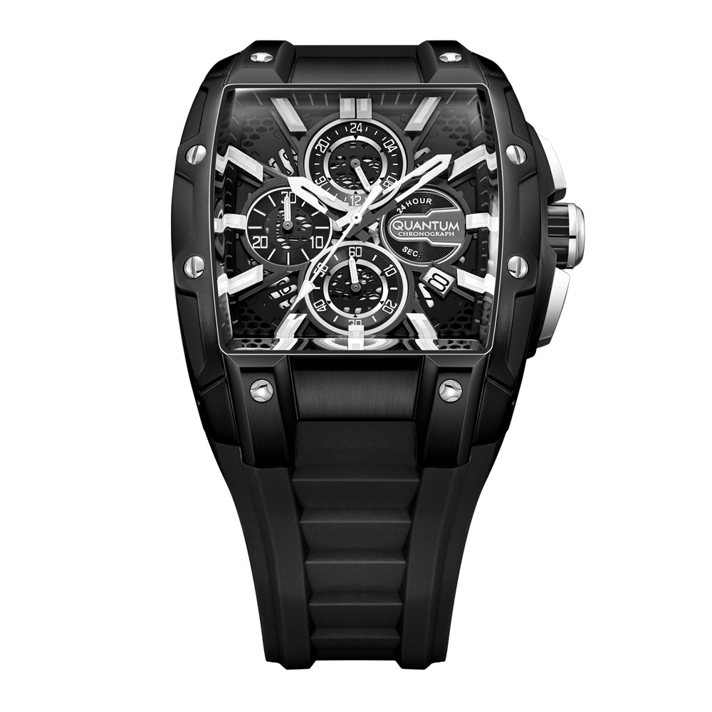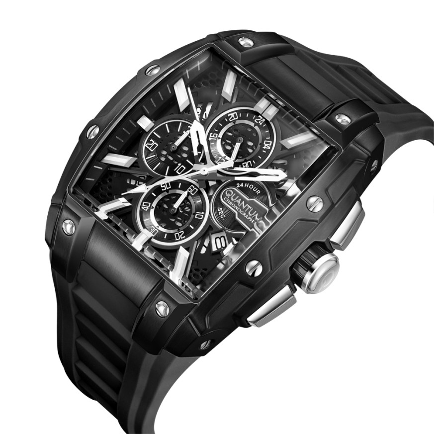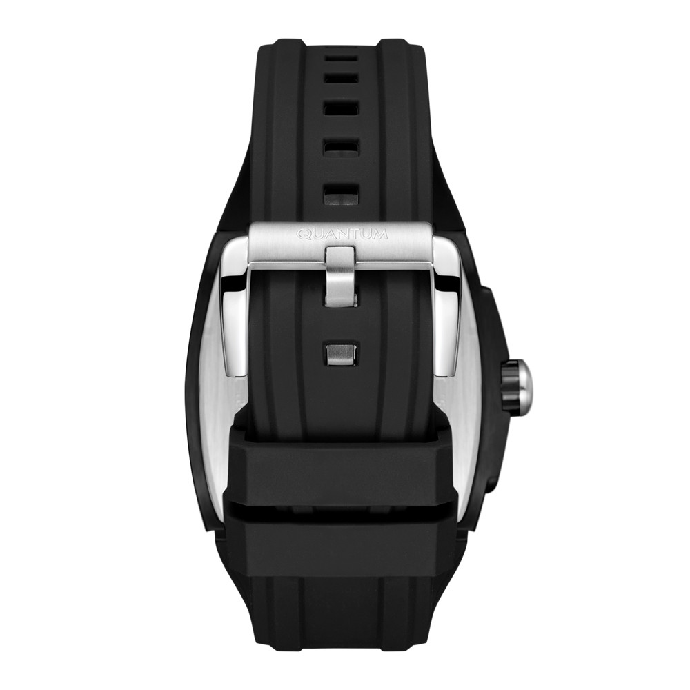 Впечатляващ модел мъжки часовник Quantum от колекцията Hunter. Дисплей хронограф в черен цвят със сребристи  детайли. Луминесцентно покритие върху стрелките и индексите. Стъкло минерал-кристал с антирефлексно покритие. Корпус от неръждаема стомана в комбинация със силиконова каишка. Задвижва се от кварцов механизъм. Водоустойчивост 10 ATM - позволява мокрене, къпане и плуване във водни басейни.