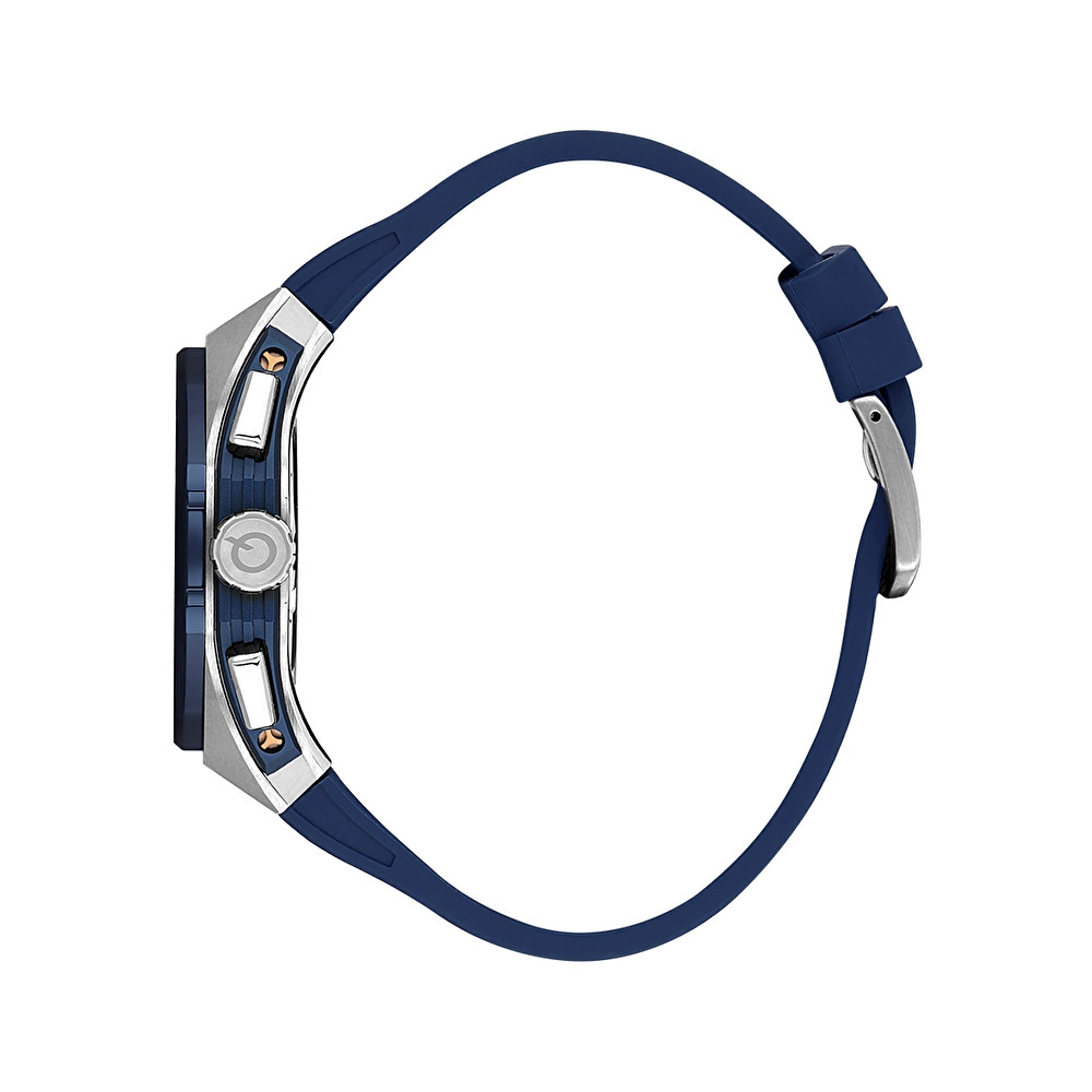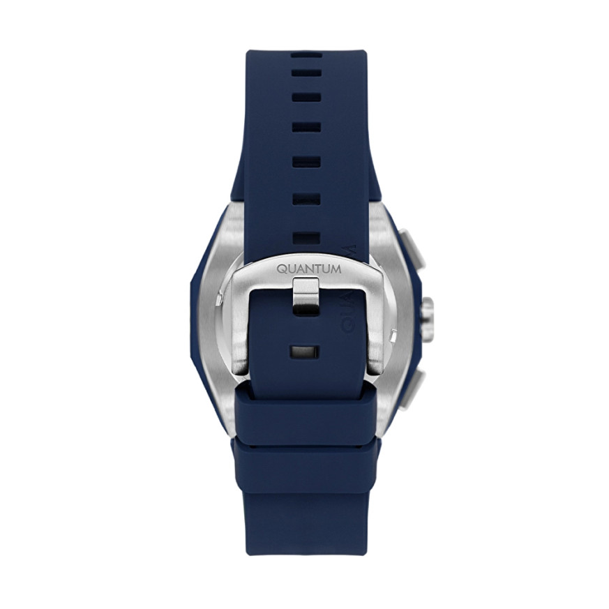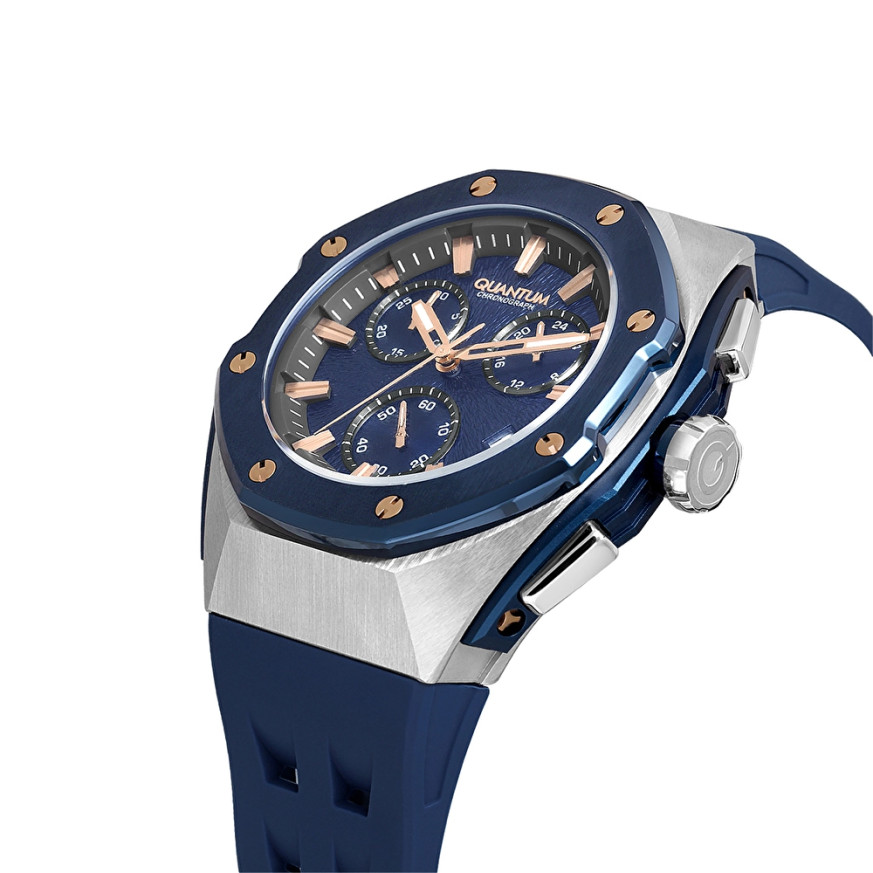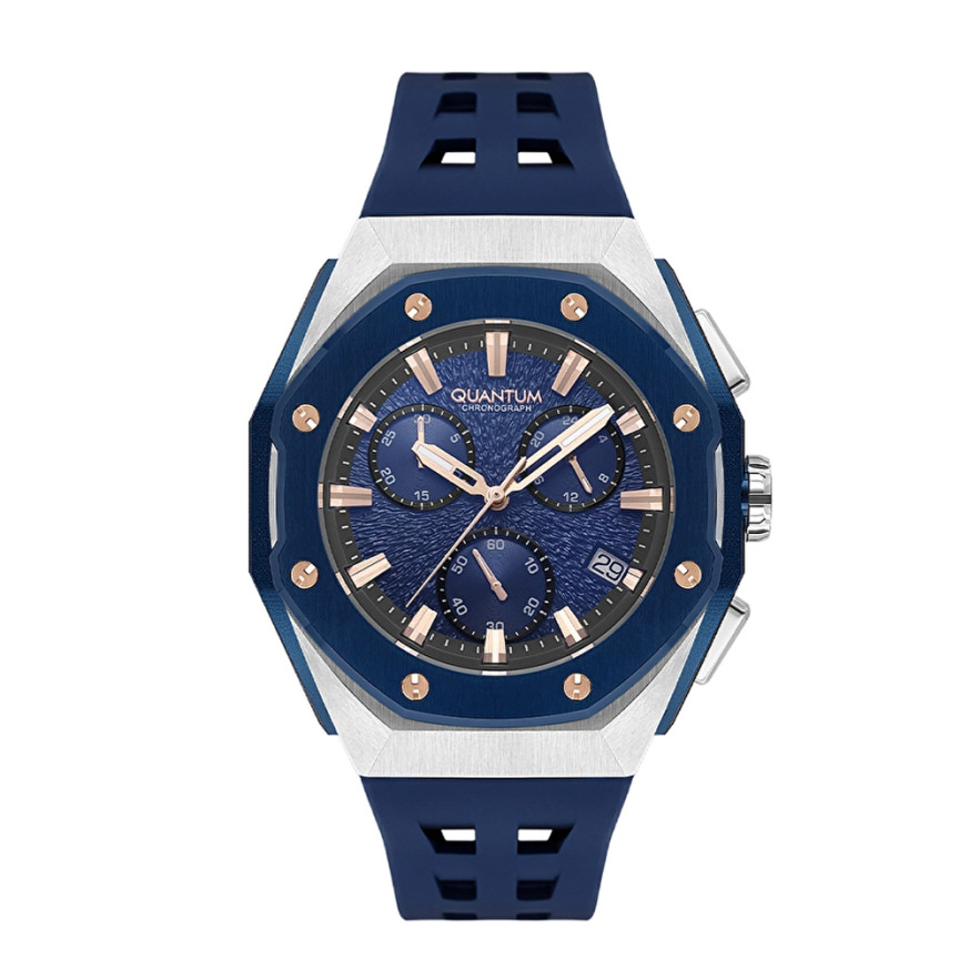 Мъжки часовник Quantum със спортен дизайн от колекцията Hunter. Тъмноисн дисплей хронограф с детайли в цвят розово злато. Луминесцентно покритие върху стрелките. Стъкло минерал-кристал . Корпус от неръждаема стомана в комбинация със силиконова каишка. Задвижва се от кварцов механизъм с калибър VR34B12. Диаметър на корпуса 46 мм. Водоустойчивост 10 ATM - позволява мокрене, къпане и плуване във водни басейни.