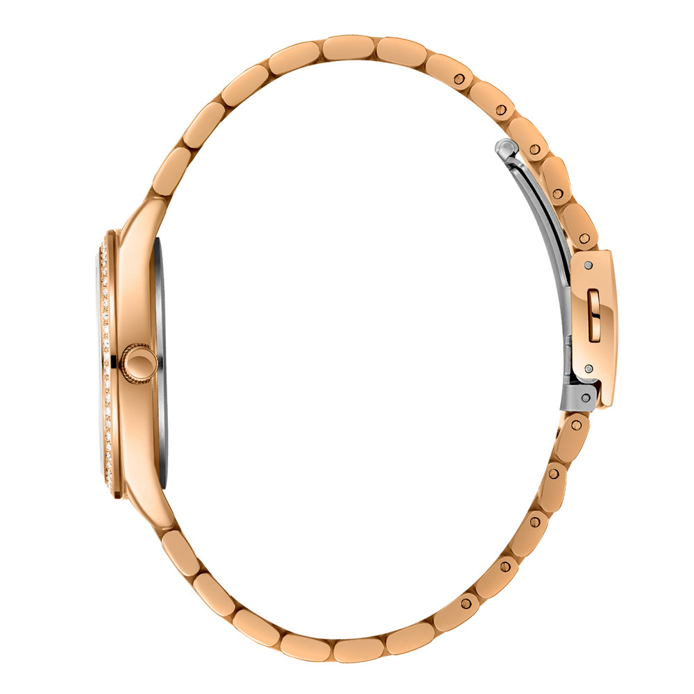 Дамски часовник Lee Cooper с модерна визия от колекцията Elegance. Тъмносин аналогов дисплей със стрелки и индекси в цвят розово злато. Безел с декорация от бляскави кристали. Стъкло минерал-кристал. Корпус изработен от супер метал - специална сплав, създадена от марката. Диаметър на корпуса 32 мм. Верижка от неръждаема стомана. Задвижва се от кварцов механизъм. Водоустойчивост 3 ATM - допускат се леки пръски, не се препоръчва обилно мокрене.