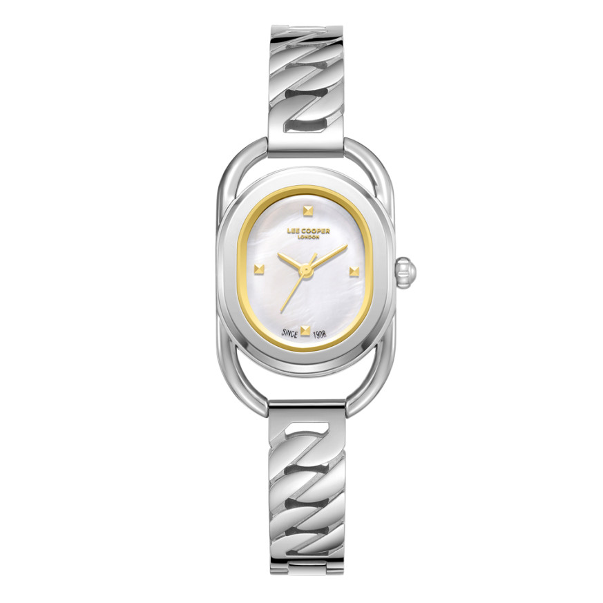 Дамски часовник Lee Cooper със спортно-елегантна визия от колекцията Elegance. Аналогов седефен дисплей с изчистен дизайн, стрелки и индекси в цвят злато . Стъкло минерал-кристал. Корпус изработен от супер метал - специална сплав, създадена от марката. Верижка с интересна плетка от неръждаема стомана. Задвижва се от кварцов механизъм. Водоустойчивост 3 ATM - допускат се леки пръски, не се препоръчва обилно мокрене.