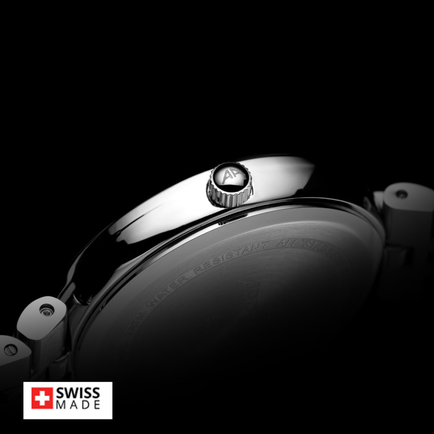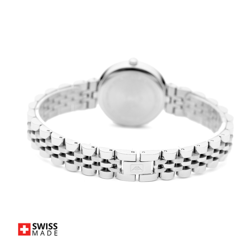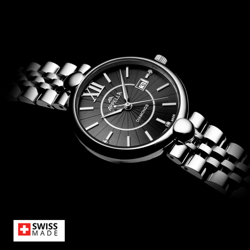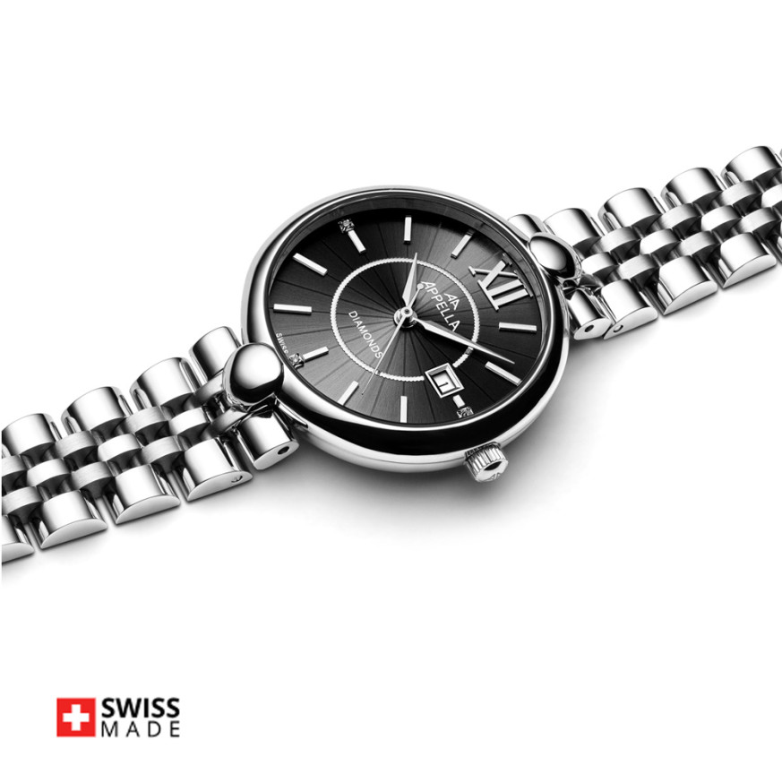 Appella L50011.5166DQ впечатлява с изтънчен стил и модерна естетика. Финтo оформеният тъмносив циферблат е акцентиран с диамантени маркери, които добавят елегантен блясък. Корпусът и верижката от благородна стомана осигуряват надеждна устойчивост и изчистена визия, а сапфир-кристалът с антирефлексно покритие гарантира отлична защита от надраскване. Моделът разполага с показател за дата и се задвижва от швейцарски кварцов механизъм ETA F04, осигуряващ прецизност и дълготрайна надеждност. Идеален избор за дами, които ценят съчетанието от стил, деликатност и швейцарско качество.