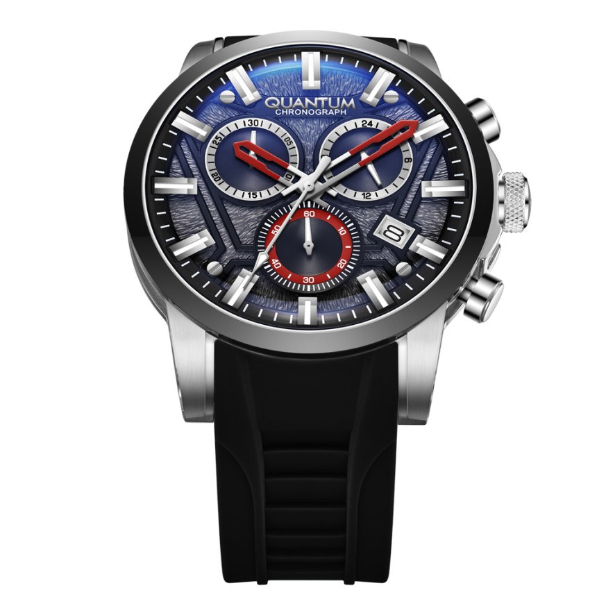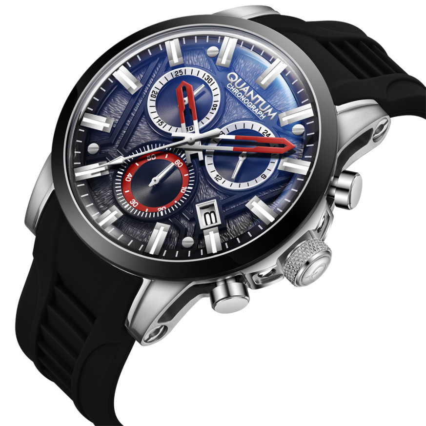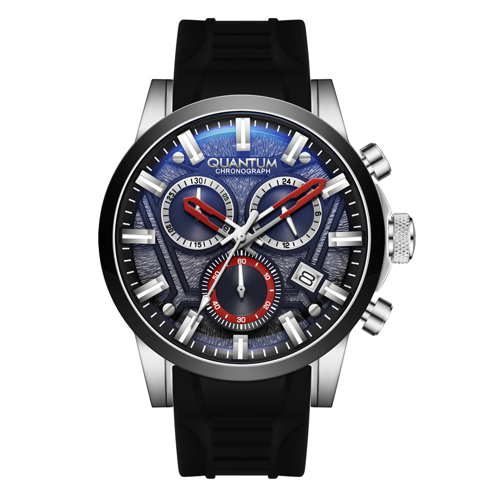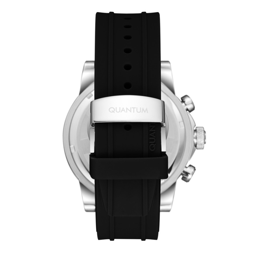 Впечатляващ мъжки часовник Quantum с дисплей хронограф. Корпус изработен от неръждаема стомана. Силиконова каишка в черен цвят. Стъкло минерал-кристал. Диаметър на корпуса 45 мм. Часовникът се задвижва от кварцов механизъм с калибър VR34B14. Водоустойчивост 10 ATM - позволява мокрене, къпане и плуване във водни басейни.