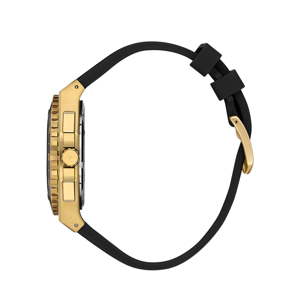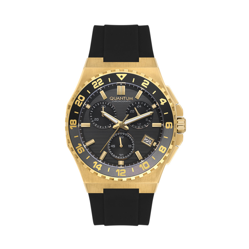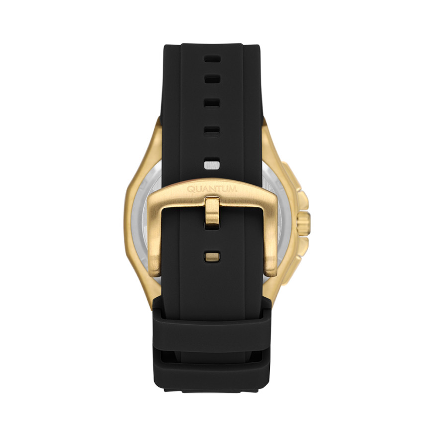 Мъжки часовник Quantum със спортен дизайн от колекцията Powertech. Дисплей хронограф в черен цвят със златисти детайли. Луминесцентно покритие върху стрелките. Стъкло минерал-кристал. Корпус изработен от неръждаема стомана. Черна силиконова каишка. Диаметър на корпуса 43.50  мм. Часовникът се задвижва от кварцов механизъм. Водоустойчивост 10 ATM - позволява мокрене, къпане и плуване във водни басейни.