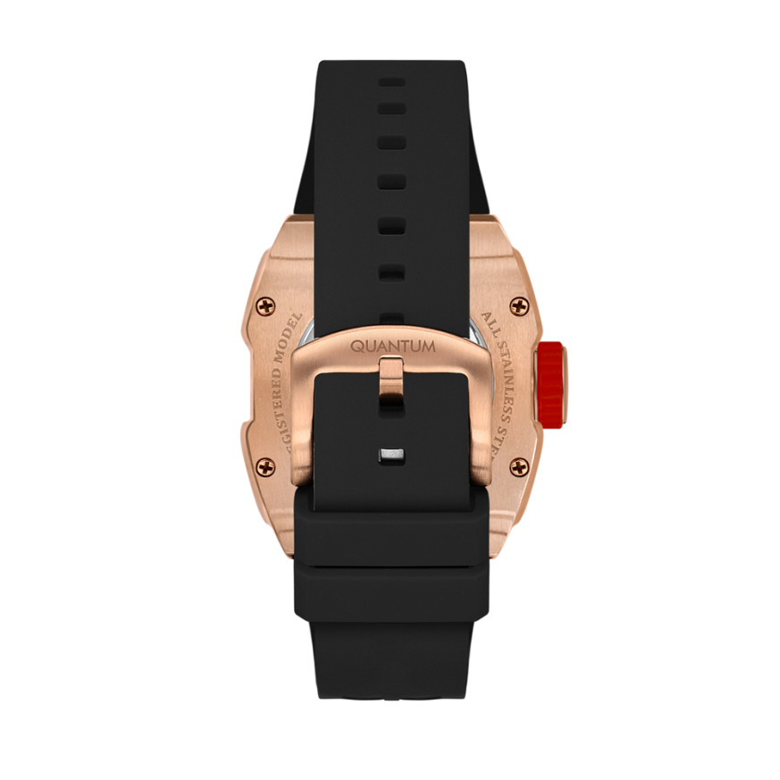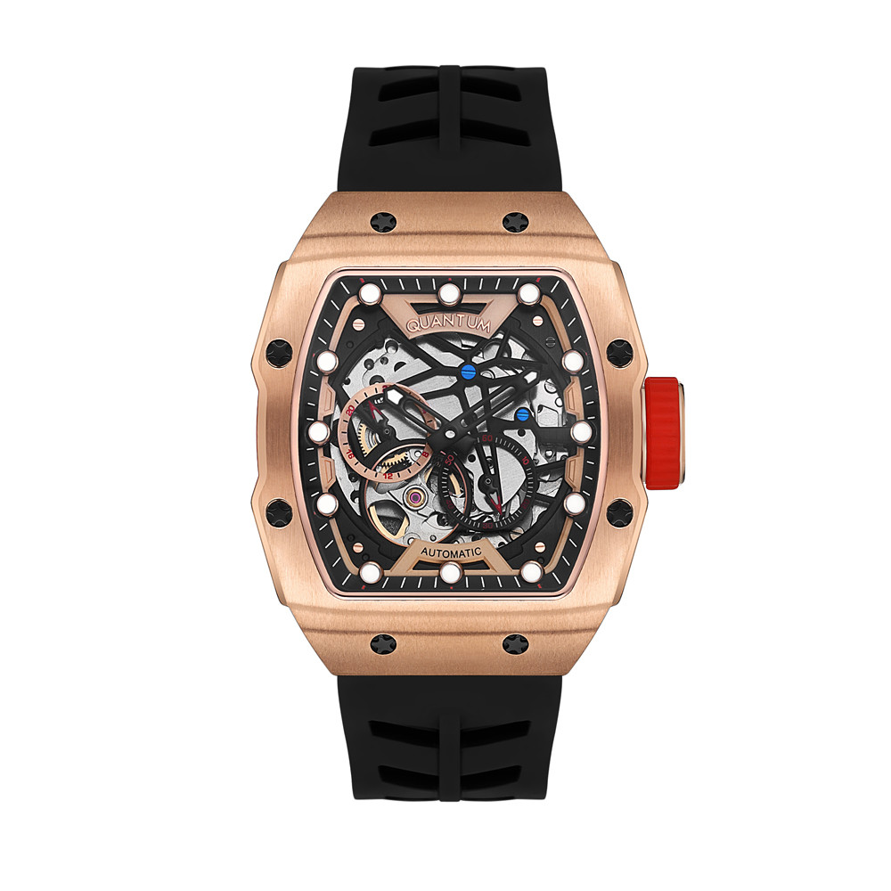Впечатляващ модел мъжки часовник Quantum от колекцията Q-Master. Дисплей скелетон с луминесцентно покритие на стрелките и индексите. Стъкло минерал-кристал . Корпус от неръждаема стомана в комбинация със силиконова каишка. Часовникът се задвижва от автоматичен механизъм с калибър 82S7. Водоустойчивост 10 ATM - позволява мокрене, къпане и плуване във водни басейни.