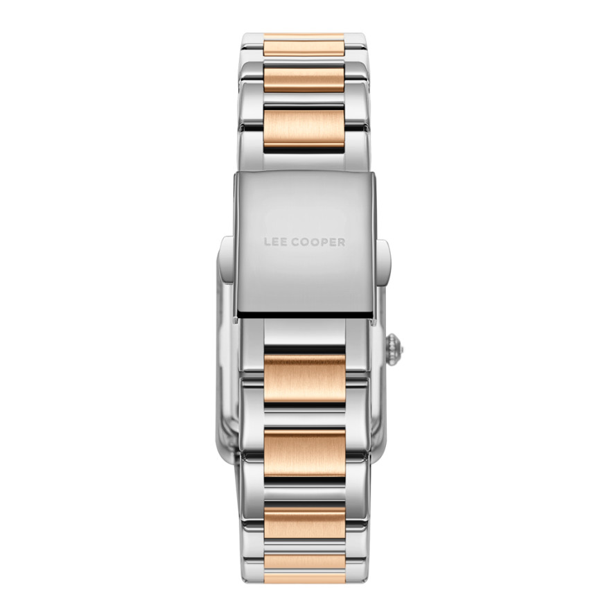 Дамски часовник Lee Cooper с класически дизайн от колекцията Elegance. Сив аналогв дисплей със сини стрелки  и черни римски цифри. Стъкло минерал-кристал. Корпус изработен от супер метал - специална сплав, създадена от марката. Верижка от неръждаема стомана. Задвижва се от кварцов механизъм. Водоустойчивост 3 ATM - допускат се леки пръски, не се препоръчва обилно мокрене.