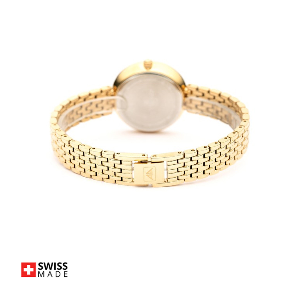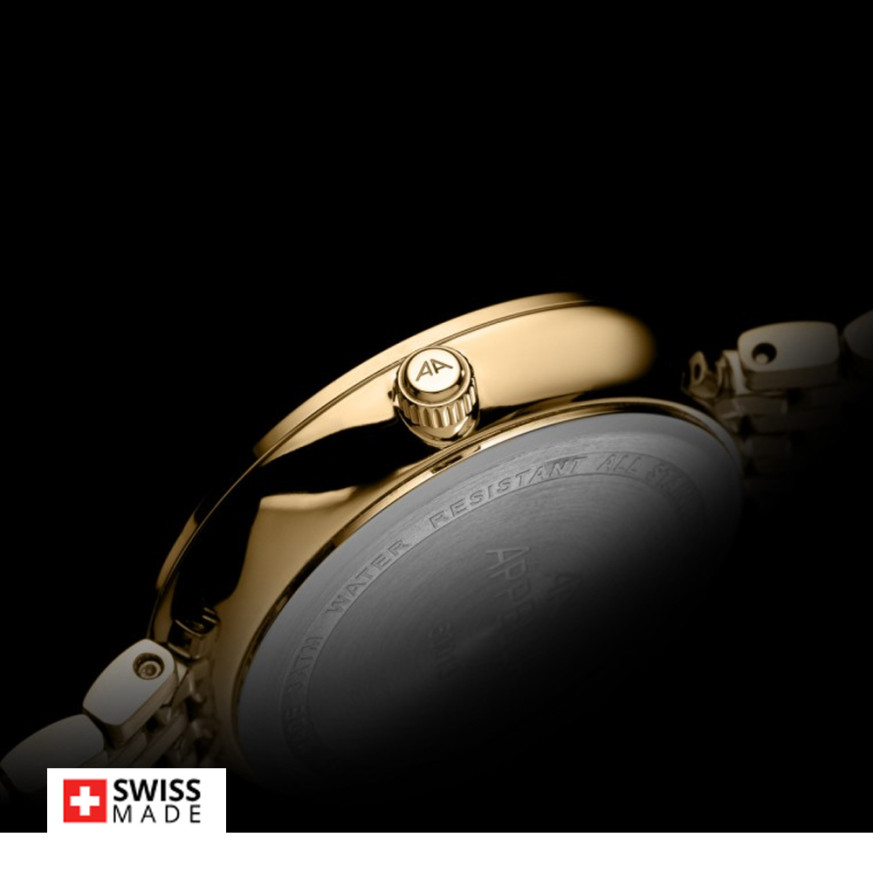Appella L50013.1197DQ впечатлява с модерно излъчване, допълнено от класическа елегантност. Златистият корпус и верижка от благородна стомана подчертават луксозния характер на модела, а сивият циферблат е декориран с четири естествени диаманта и показател за дата. Сапфир-кристалът с антирефлексно покритие осигурява отлична защита и висококачествена четимост. Швейцарският кварцов механизъм ETA F04 гарантира точност, а компактният 30 мм размер прави часовника идеален за ежедневно носене с изискан стил.