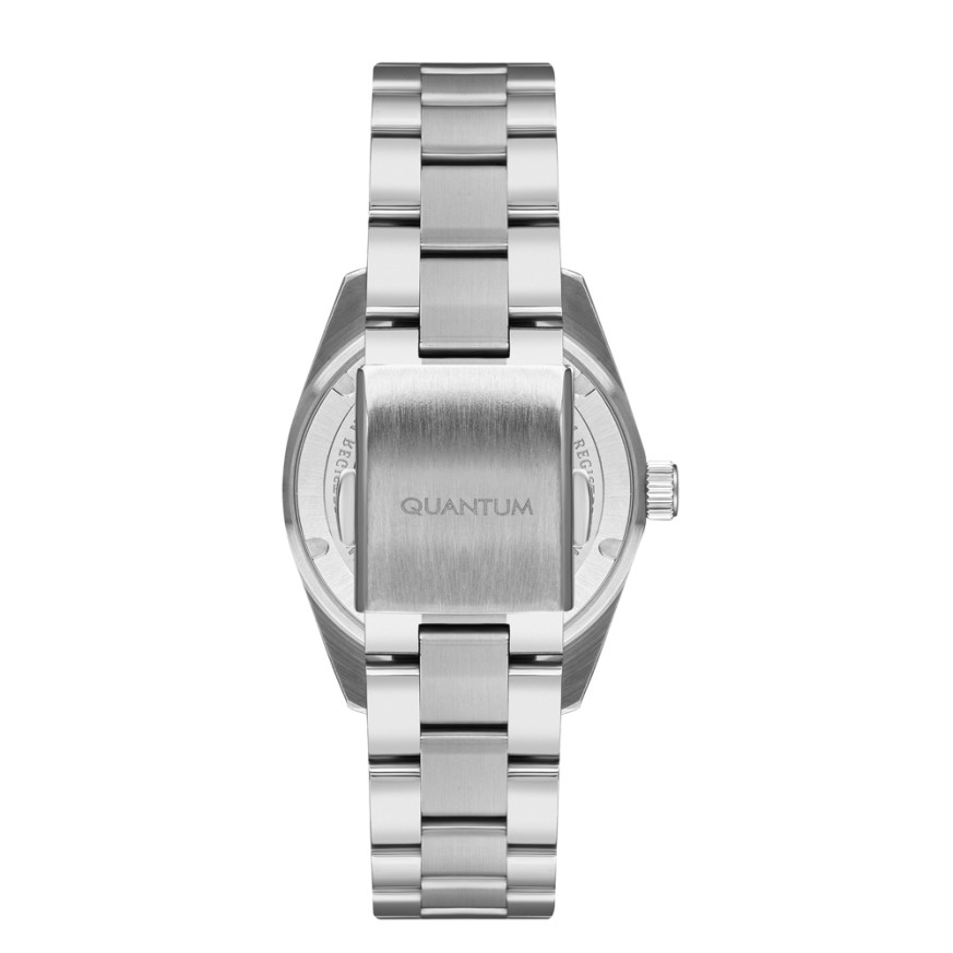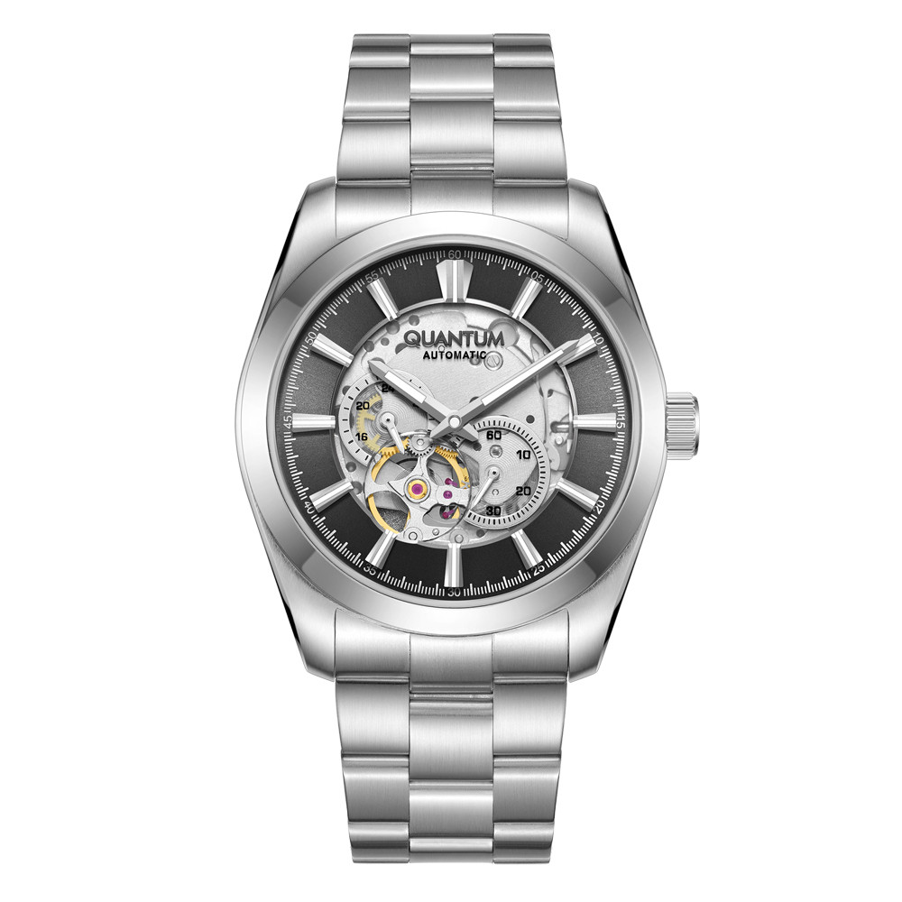 Мъжки часовник Quantum със спортно-елегантен дизайн от колекцията Q-Master. Аналогов дисплей с полускелетонизиран дизайн с видим баланс, 24-часов формат и отделен секундарник. Стъкло сапфир-кристал. Корпус и верижка от неръждаема стомана. Диаметър на корпуса 41 мм. Часовникът се задвижва от автоматичен механизъм с калибър 82S7. Водоустойчивост 10 ATM - позволява мокрене, къпане и плуване във водни басейни.