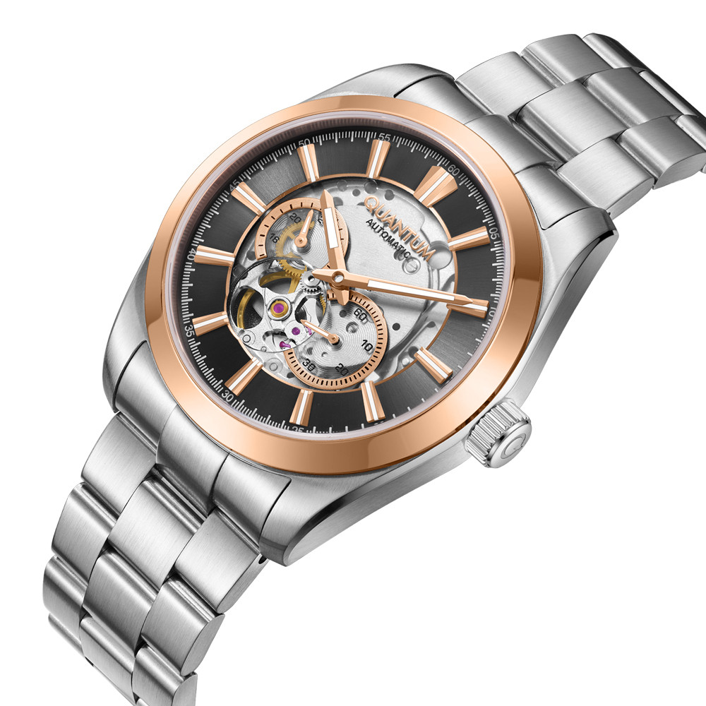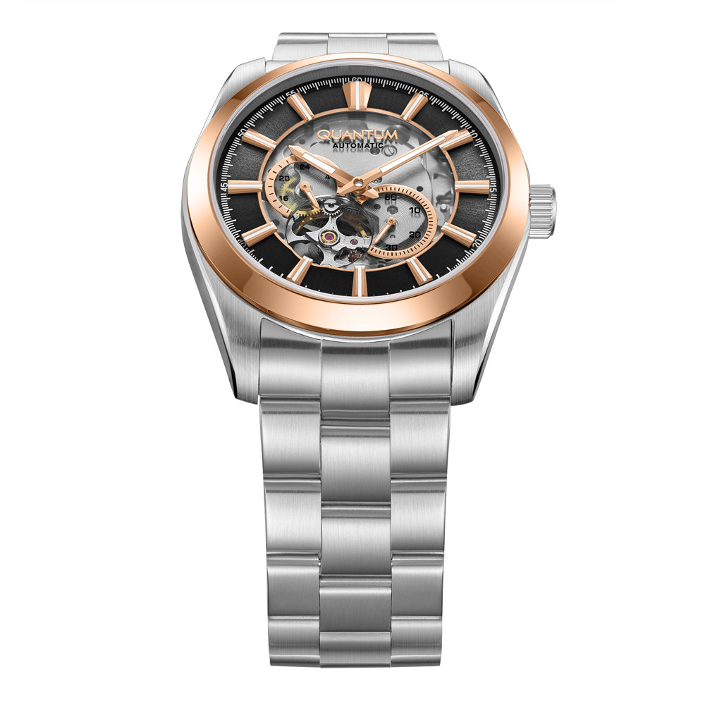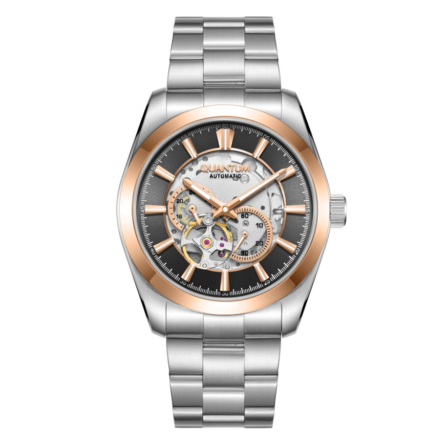 Мъжки часовник Quantum със спортно-елегантен дизайн от колекцията Q-Master. Аналогов дисплей с полускелетонизиран дизайн с видим баланс, 24-часов формат и отделен секундарник. Стъкло сапфир-кристал. Корпус и верижка от неръждаема стомана. Диаметър на корпуса 41 мм. Часовникът се задвижва от автоматичен механизъм с калибър 82S7. Водоустойчивост 10 ATM - позволява мокрене, къпане и плуване във водни басейни.