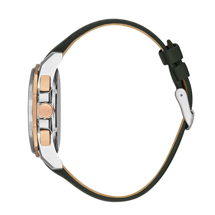 Мъжки часовник със спортно-елегантен дизайн от колекцията Prive. Мултифункционален дисплей с показатели за дата, ден и двойно време. Корпус от стомана в комбинация с каишка от естествена кожа. Минерално стъкло, устойчиво на надраскване. Задвижва се от кварцов механизъм. Водоустойчивост 5 ATM - допускат се леки пръски и взимане на душ, не се препоръчва обилно мокрене.