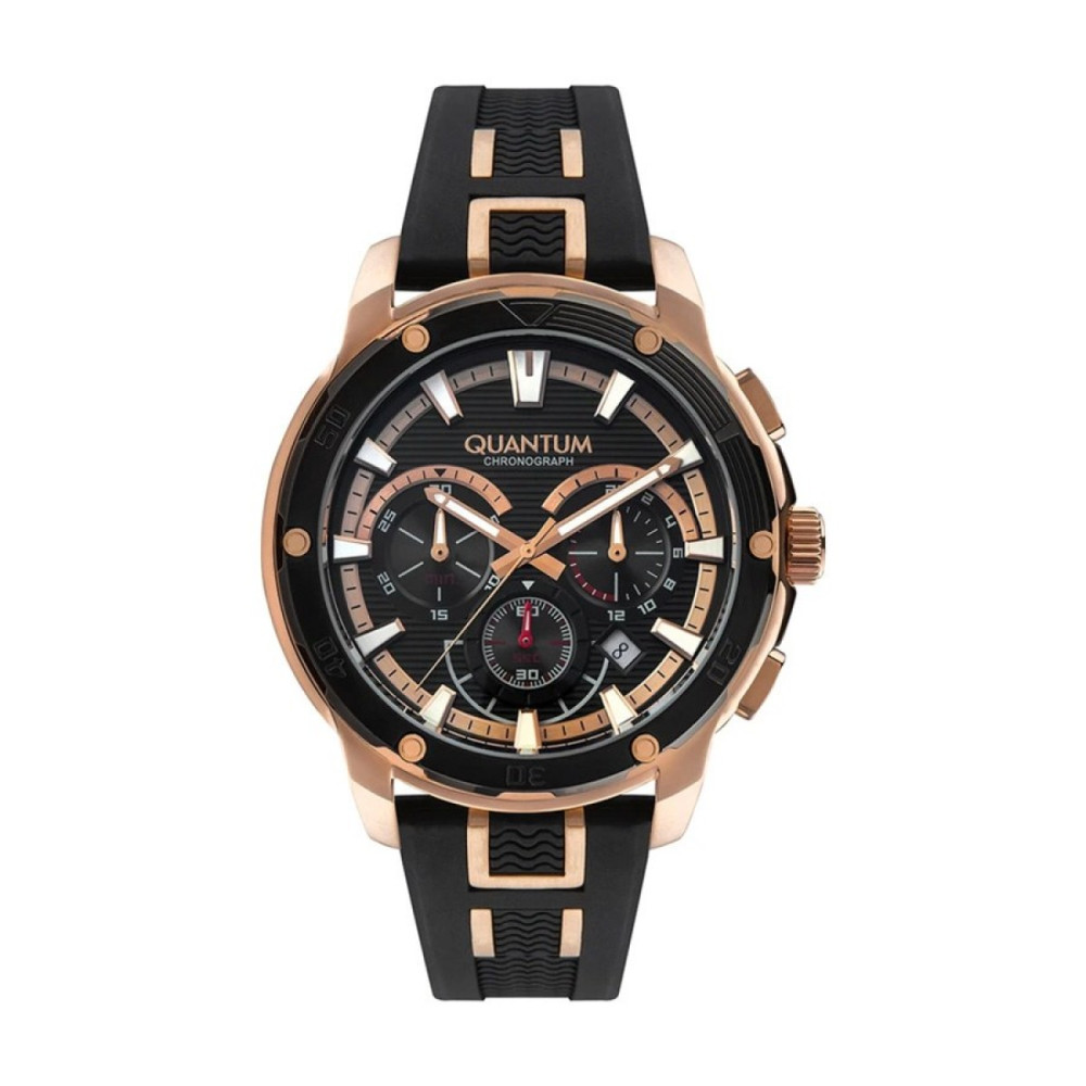 Мъжки часовник Quantum със спортно-елегантен дизайн от колекцията Powertech. Черен дисплей хронограф с детайли в цвят розово злато. Луминесцентно покритие върху стрелките и индексите. Стъкло минерал-кристал с антирефлексно покритие. Корпус от неръждаема стомана. Черна силиконова каишка. Часовникът се задвижва от кварцов механизъм с калибър VR32B15. Водоустойчивост 10 ATM - позволява мокрене, къпане и плуване във водни басейни.