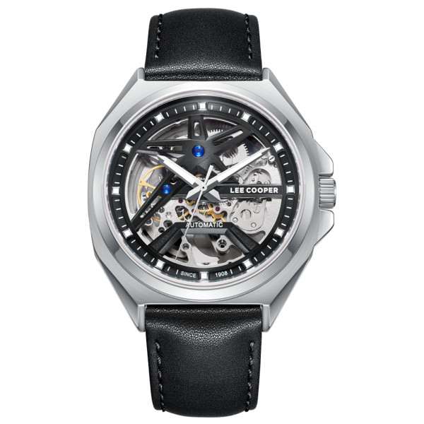 Впечатляващ мъжки часовник Lee Cooper от колекцията Classic. Моделът е с дисплей тип скелетен, през който може да се види автоматичния механизъм калибър G3265ZH. Стъклото е минерал-кристал. Корпусът е изработен от супер метал - специална сплав, създадена от марката. Каишката е от естествена кожа. Диаметър на корпуса 44 мм. Водоустойчивост 5 ATM - допускат се леки пръски и взимане на душ, не се препоръчва обилно мокрене.