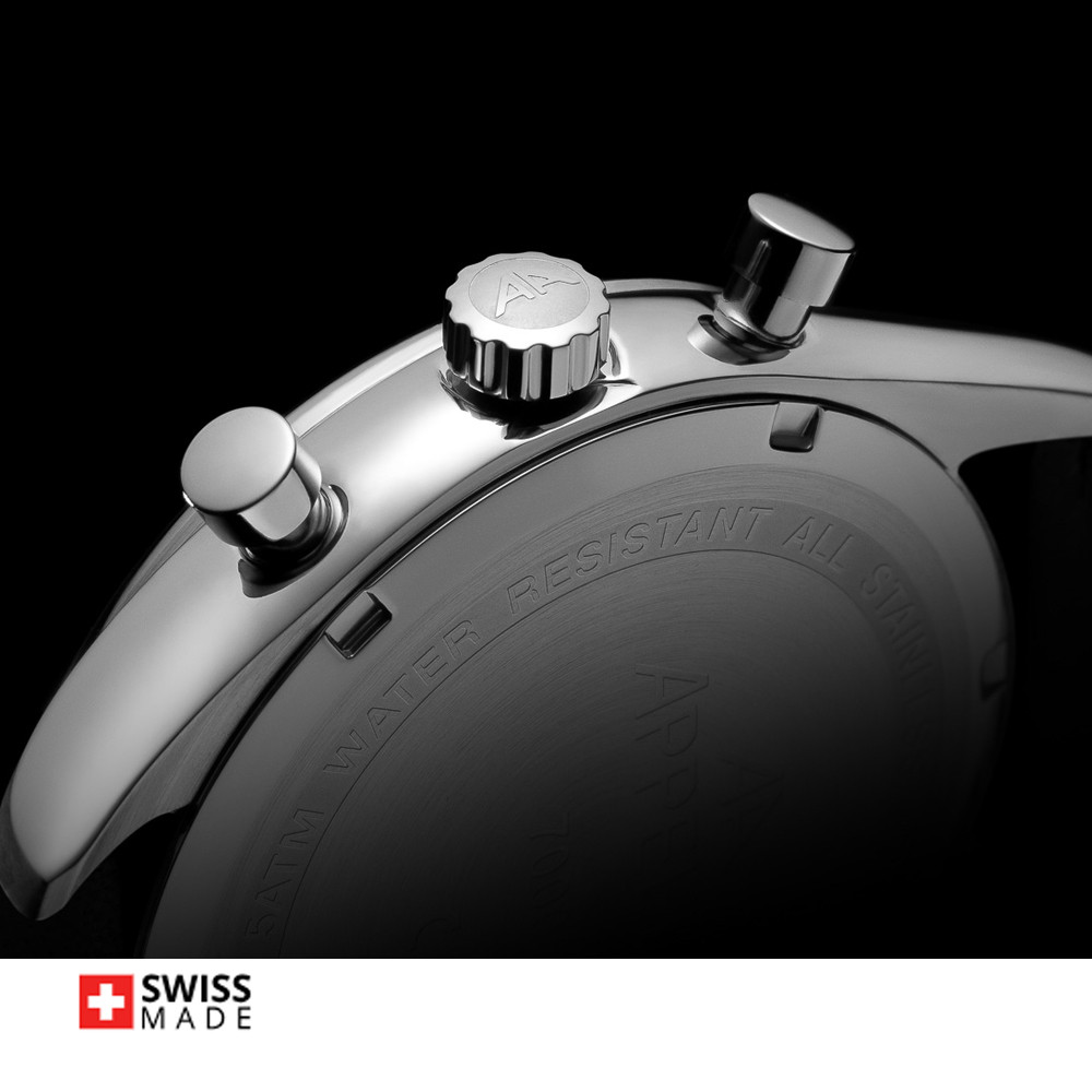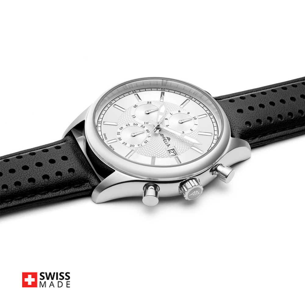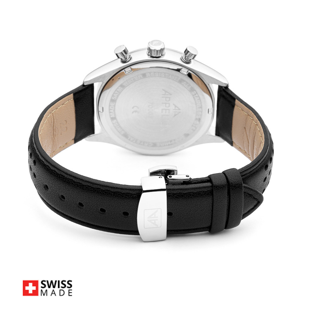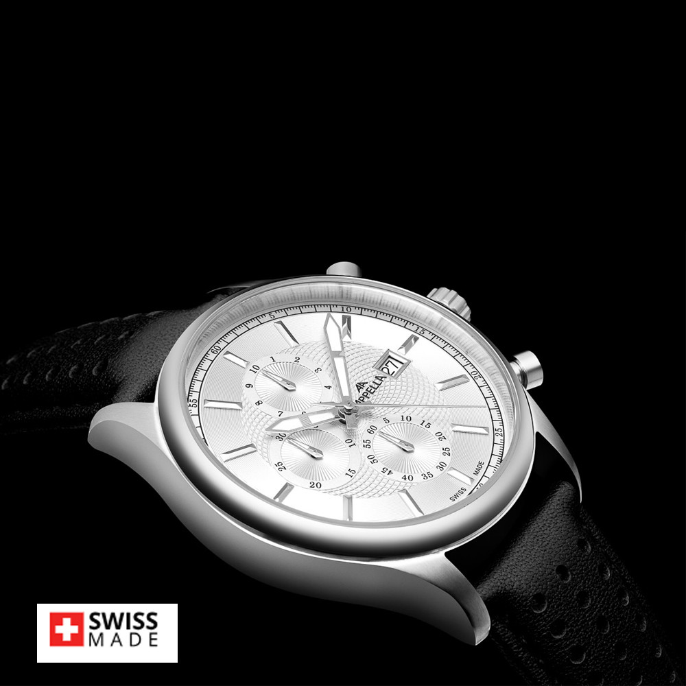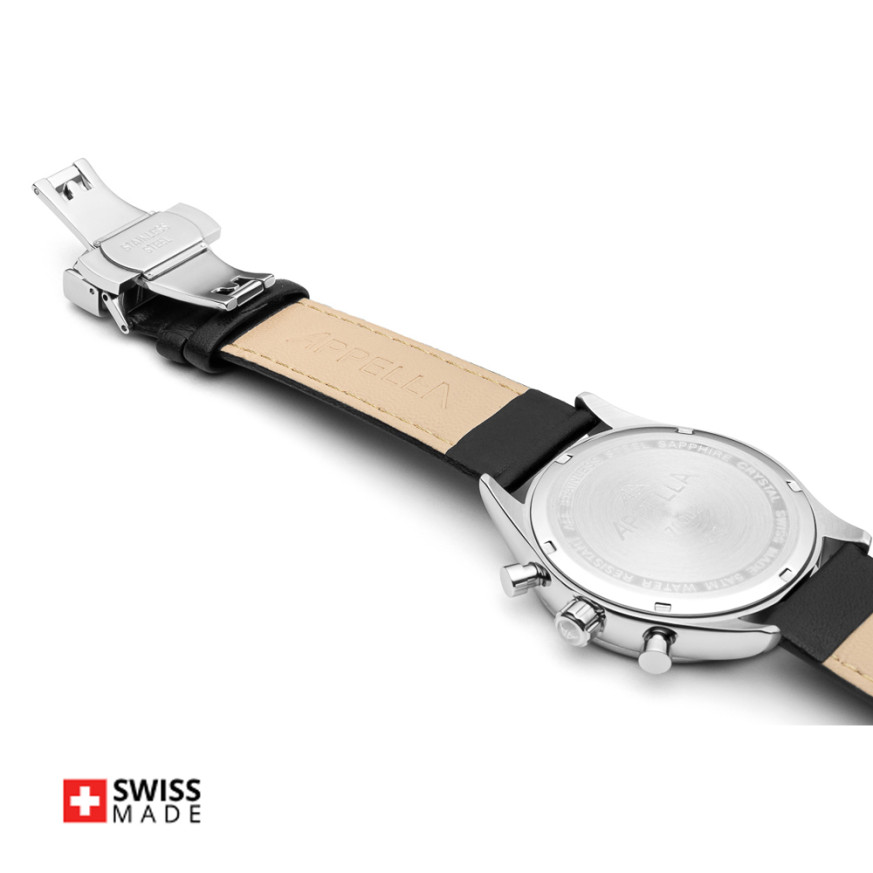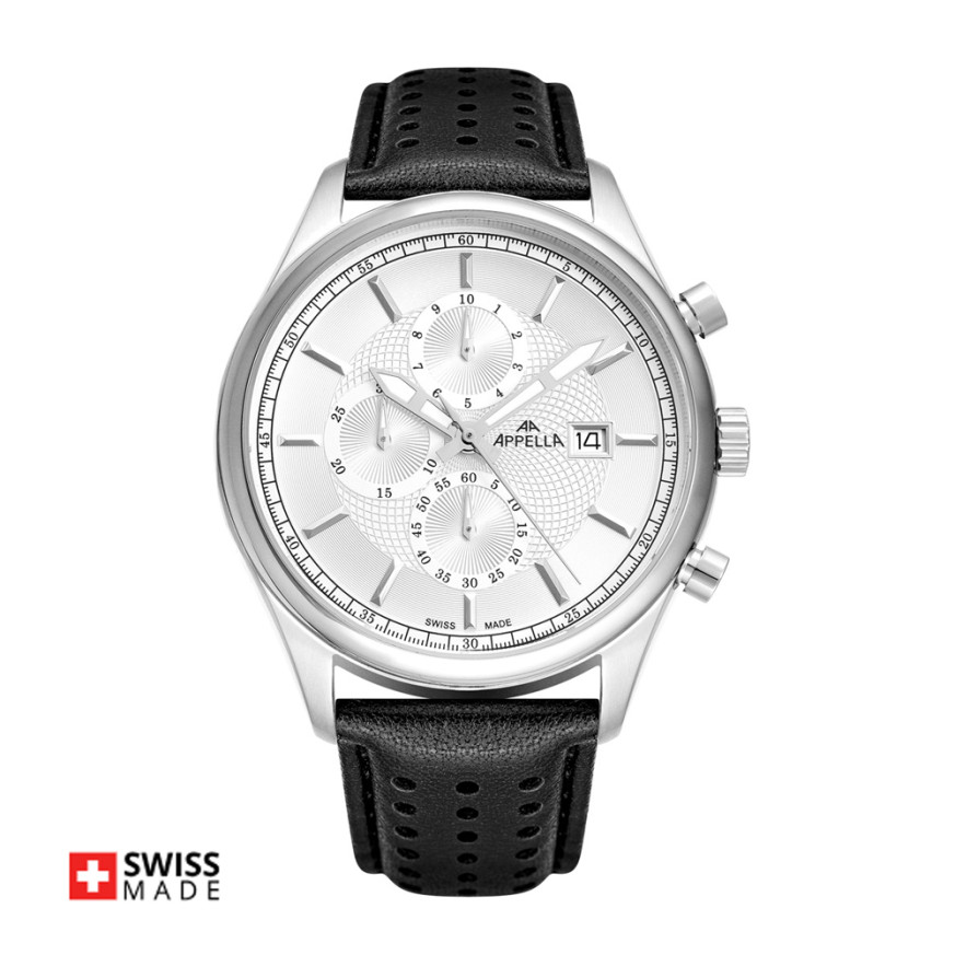 Мъжки часовник Appella L70002.5213CH със стилен дизайн. Корпус изработен от неръждаема стомана. Черна каишка от естествена кожа. Сребрист дисплей хронограф. Стъкло сапфир-кристал. Задвижва се от кварцов механизъм RONDA 3540D Swiss Made. Диаметър на корпуса 43 мм. Водоустойчивост 5 ATM - допускат се леки пръски и взимане на душ, не се препоръчва обилно мокрене.