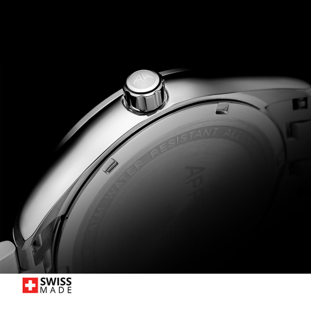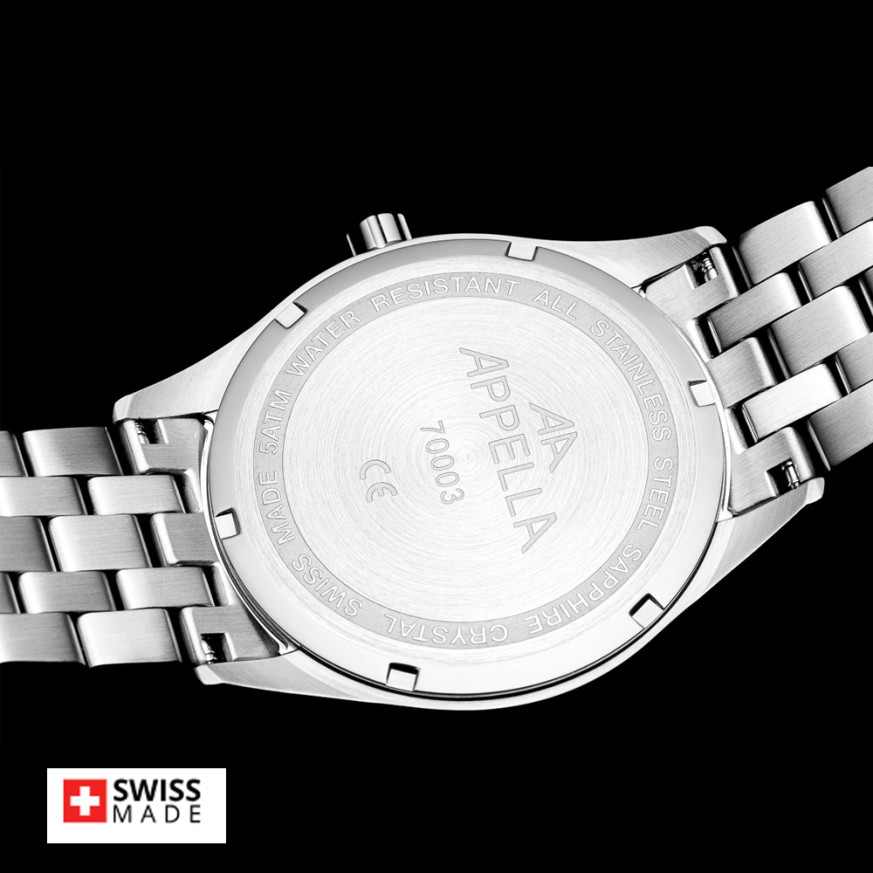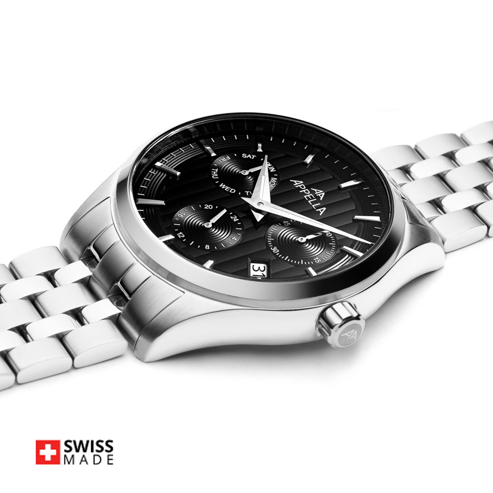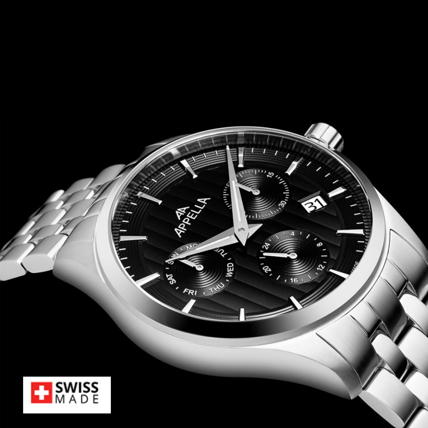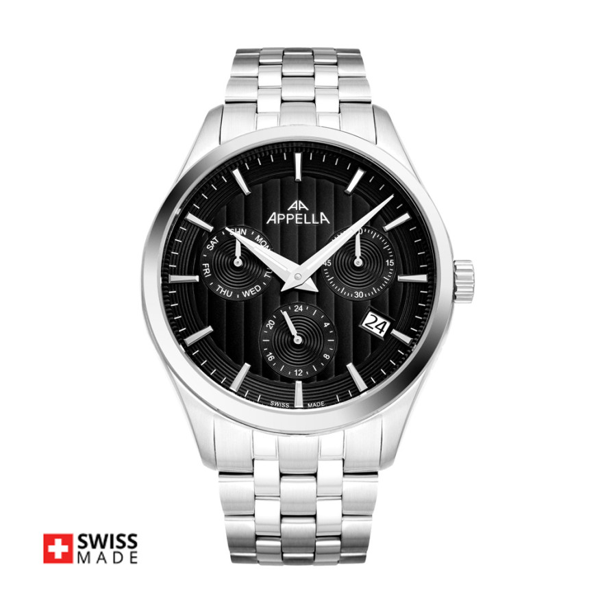 Мъжки часовник Appella L70003.5114QF с корпус и верижка от неръждаема стомана. Черен мултифункционален дисплей със сребрист детайли. Стъкло сапфир-кристал. Задвижва се от кварцов механизъм RONDA X30 Swiss Made. Диаметър на корпуса 43 мм. Водоустойчивост 5 ATM - допускат се леки пръски и взимане на душ, не се препоръчва обилно мокрене.