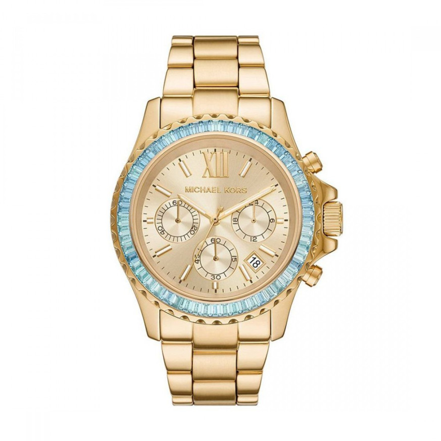 Часовник Michael Kors MK7210 – забележителен дамски модел от колекцията Everest, отличаващ се с лукс, прецизност и впечатляващо излъчване. Изработен изцяло от неръждаема стомана с покритие в цвят жълто злато, този часовник впечатлява със златист циферблат, хронограф и датник между 4 и 5 часа. Безелът е инкрустиран с тюркоазени кристали, които придават блясък и индивидуалност. С водоустойчивост до 10 ATM, MK7210 е перфектен баланс между елегантност и функционалност.