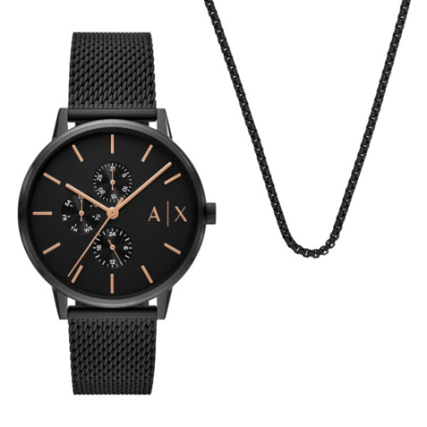 Мъжки Сет Armani Exchange AX7162SET   Armani Exchange AX7162SET от колекция Cayde e сет от мъжки кварцов часовник и черно колие от неръждаема стомана. Часовникът е с черен кръгъл циферблат, черен корпус от неръждаема стомана с диаметър 42 mm и черна верижка 20 mm, изработена от неръждаема стомана.