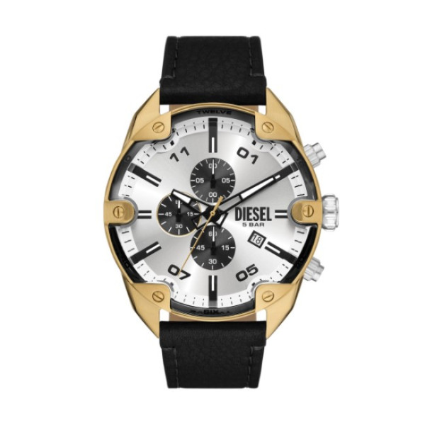 Diesel DZ4671 Spiked Chronograph е смел мъжки хронограф с иновативен индустриален дизайн. С диаметър 49 мм корпус от неръждаема стомана с златисто покритие, моделът впечатлява с декоративни „шипове“ около циферблата. Самият циферблат е сребрист sunray и включва три хронографски субскали и малък прозорец за дата . Каишката е от черна естествена кожа (ширина ~24 мм), подсигурена с класическа катарама. Водоустойчивостта до 5 ATM го прави подходящ за ежедневно носене и ежедневни водни активности