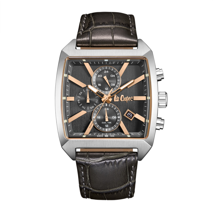 Стилен мъжки часовник Lee Cooper. Тъмносив мултифункционален дисплей с детайли в цвят розово злато,  показатели за дата, ден от седмицата, 24-часов формат и двойно време. Стъкло минерал-кристал. Корпус от супер метал - специална сплав, създадена от марката. Каишка от естествена кожа. Задвижва се от кварцов механизъм. Водоустойчивост 5 ATM - допускат се леки пръски и взимане на душ, не се препоръчва обилно мокрене.