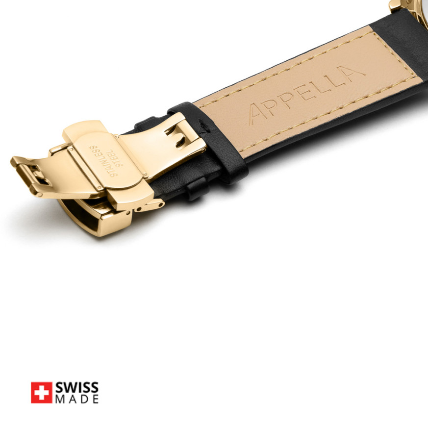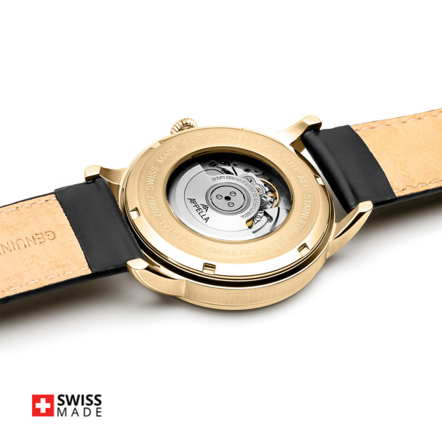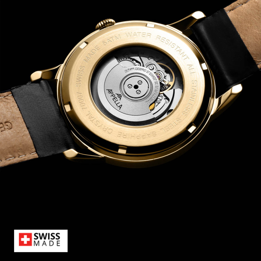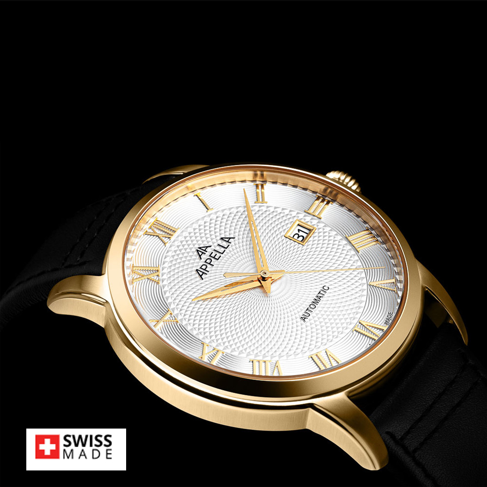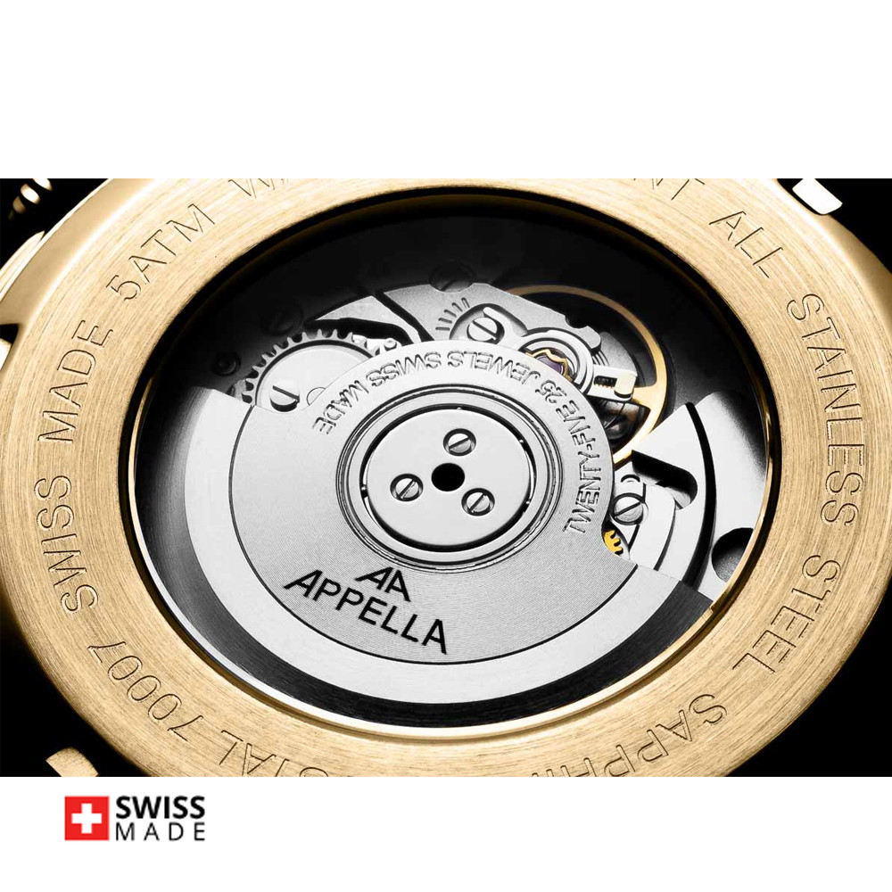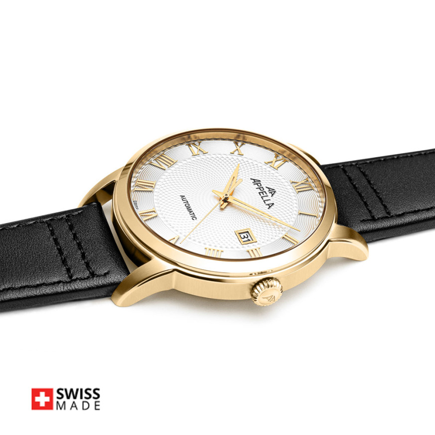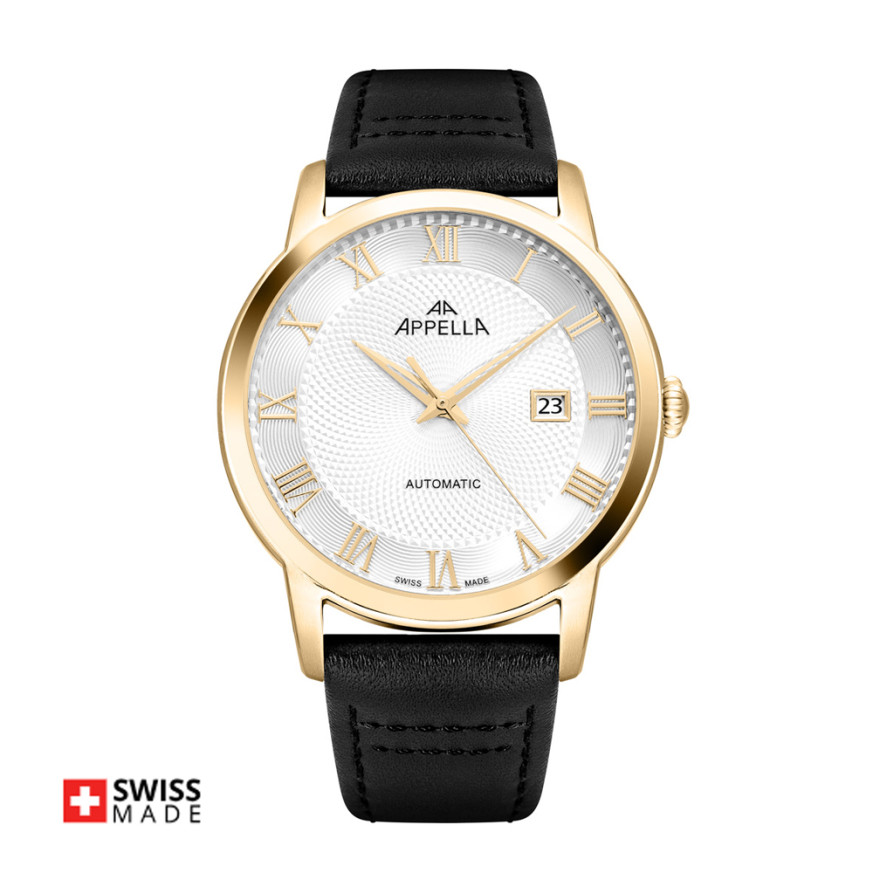 Мъжки часовник Appella L70007.1233A впечатлява със своята елегантна визия. Корпусът е с диаметър 43 мм. и дебелина 10 мм, изработен от неръждаема стомана. Каишката е от естествена кожа в черен цвят. Стъклото е  сапфир-кристал. Дисплеят е аналогов в сребрист цвят с показател за дата. Часовникът се задвижва от автоматичен механизъм RONDA 150 Swiss Made. През прозрачния гръб на корпуса може да се наблюдава механизма на часовника. Водоустойчивост 5 ATM - допускат се леки пръски и взимане на душ, не се препоръчва обилно мокрене.