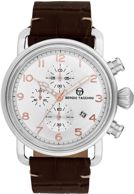 Спортно-елегантен мъжки часовник Sergio Tacchini от колекцията City Chronograph. Моделът е с дисплей хронограф (точност 1/10 от секундата и максимално измервано време 60 минути). Фосфоресцентно покритие на стрелките. Минерално стъкло, устойчиво на надраскване. Корпус от неръждаема стомана съчетан с каишка от естествена кожа. Прецизен кварцов механизъм VD57 SEIKO HATTORI произведен в Япония. Водоустойчивост 5 ATM - допускат се леки пръски и взимане на душ, не се препоръчва обилно мокрене.