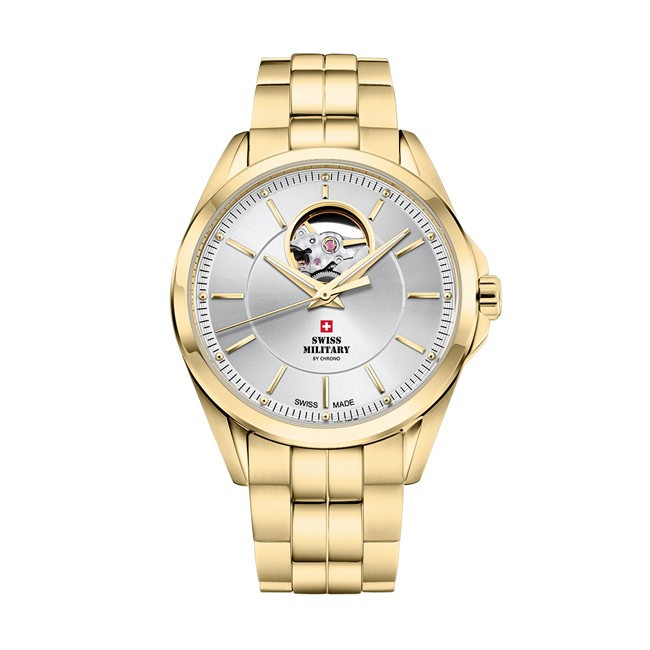 Часовник Swiss Military By Chrono SMA34085.31 е елегантен мъжки швейцарски автоматичен модел от колекцията SMA34085, който излъчва престиж и класа. Със своя бял циферблат, златист корпус и верижка от благородна стомана с PVD покритие, този модел впечатлява с изтънчен дизайн и безупречна изработка. Автоматичният механизъм Sellita SW200 гарантира надеждна прецизност, а сапфир кристалът осигурява отлична защита. Идеален избор за мъже, които ценят лукса и швейцарската точност.
