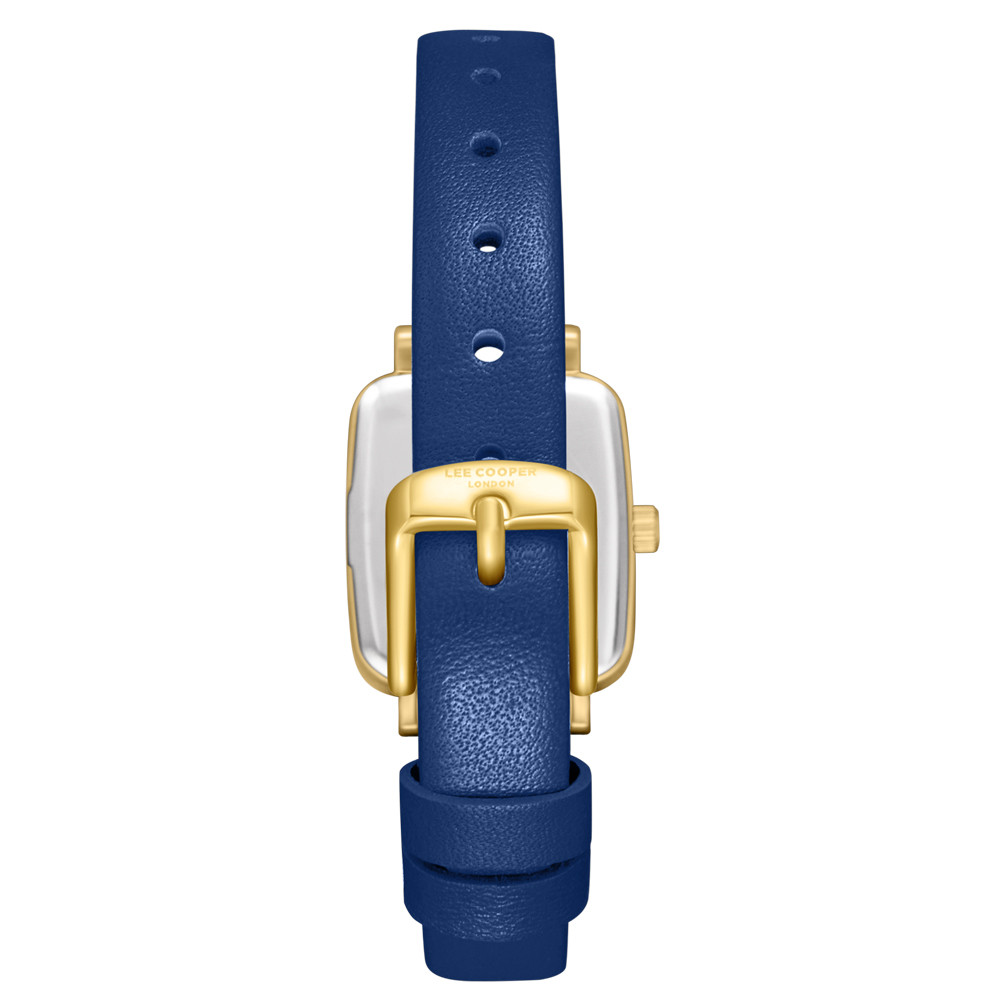 Стилен дамски часовник Lee Cooper с класически дизайн от колекцията Elegance. Аналогов дисплей в нежен седефен цвят със златисти стрелки и индекси. Стъкло минерал-кристал. Корпус изработен от супер метал - специална сплав, създадена от марката. Синя каишка от естествена кожа. Задвижва се от кварцов механизъм. Водоустойчивост 3 ATM - допускат се леки пръски, не се препоръчва обилно мокрене.