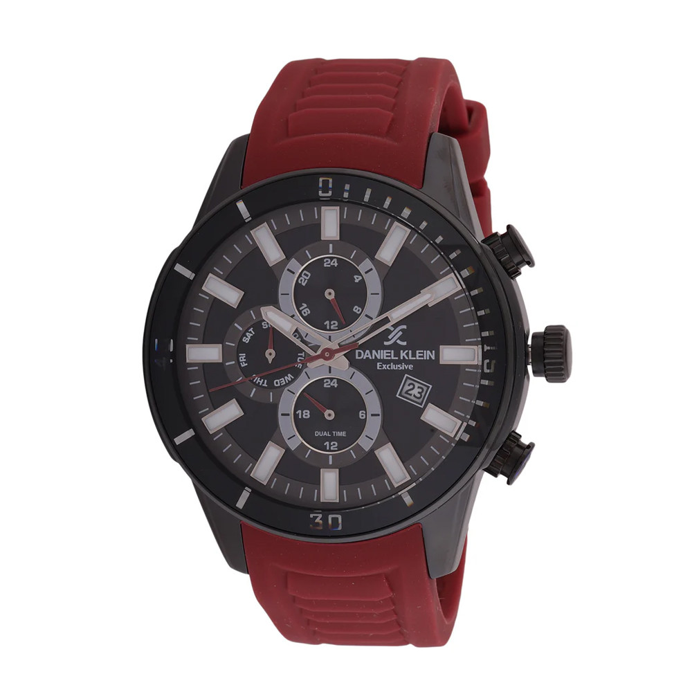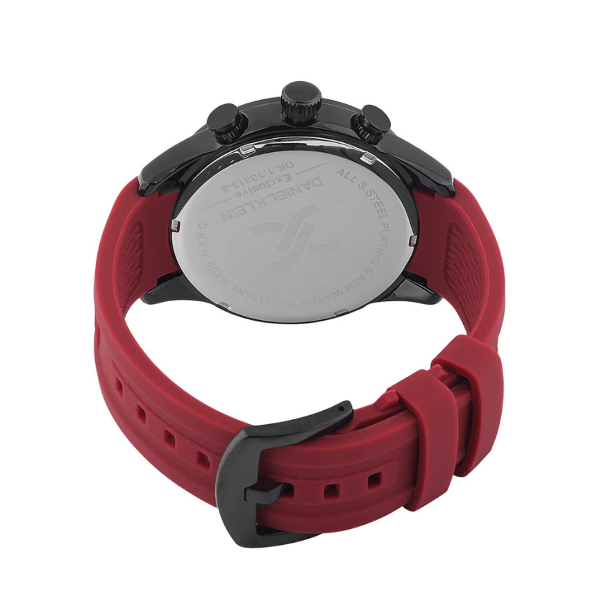 Страхотен модел мъжки часовник Daniel Klein със спортен дизайн от колекцията Exclusive.  Мултифункционален дисплей с показатели за дата, ден от седмицата, двойно време и 24 часов формат. Луминесцентно покритие върху стрелките и индексите. Корпус изработен от метал. Тъмночервена силиконова каишка. Задвижва се от кварцов механизъм. Водоустойчивост 5 ATM - допускат се леки пръски и взимане на душ, не се препоръчва обилно мокрене.