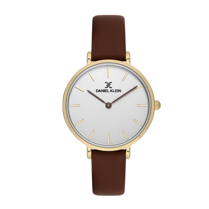 Класически модел дамски часовник Daniel Klein със стилна визия от колекцията Premium. Сребрист аналогов дисплей с изчистен дизайн. Стъкло минерал-кристал. Корпус изработен от метал.Тъмнокафява каишка от естествена кожа. Диаметър на корпуса 32 мм. Задвижва се от кварцов механизъм. Водоустойчивост 3 ATM - допускат се леки пръски, не се препоръчва обилно мокрене.