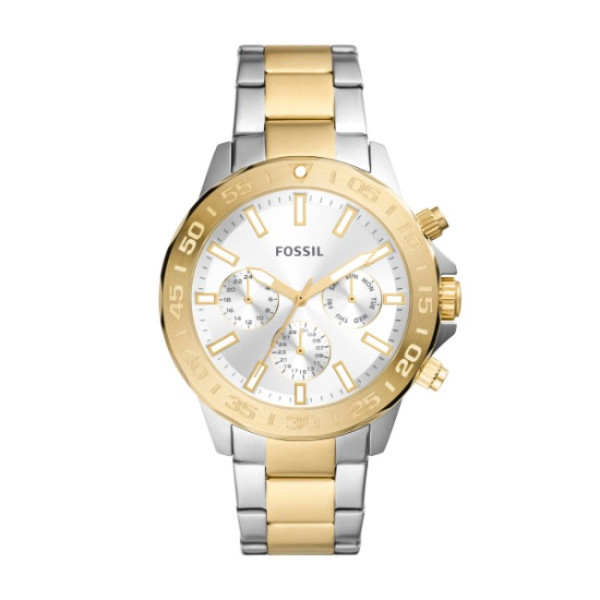 Мъжки Часовник Fossil BQ2707   Fossil BQ2707 от колекция Bannon e мъжки кварцов часовник със сребрист кръгъл циферблат, златист корпус от неръждаема стомана с диаметър 45 mm и двуцветна верижка 22 mm, изработена от неръждаема стомана.