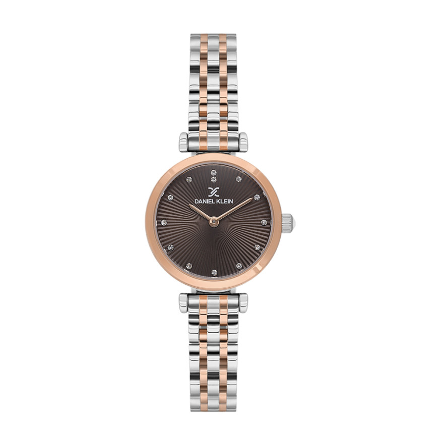Елегантен дамски часовник Daniel Klein от колекцията Premium. Аналогов дисплей в кафяв цвят с текстурирана основа и декорация от нежни кристали. Стъкло минерал-кристал. Корпус изработен от метал. Верижка от неръждаема стомана. Диаметър на корпуса 28 мм. Часовникът се задвижва от кварцов механизъм. Водоустойчивост 3 ATM - допускат се леки пръски, не се препоръчва обилно мокрене.