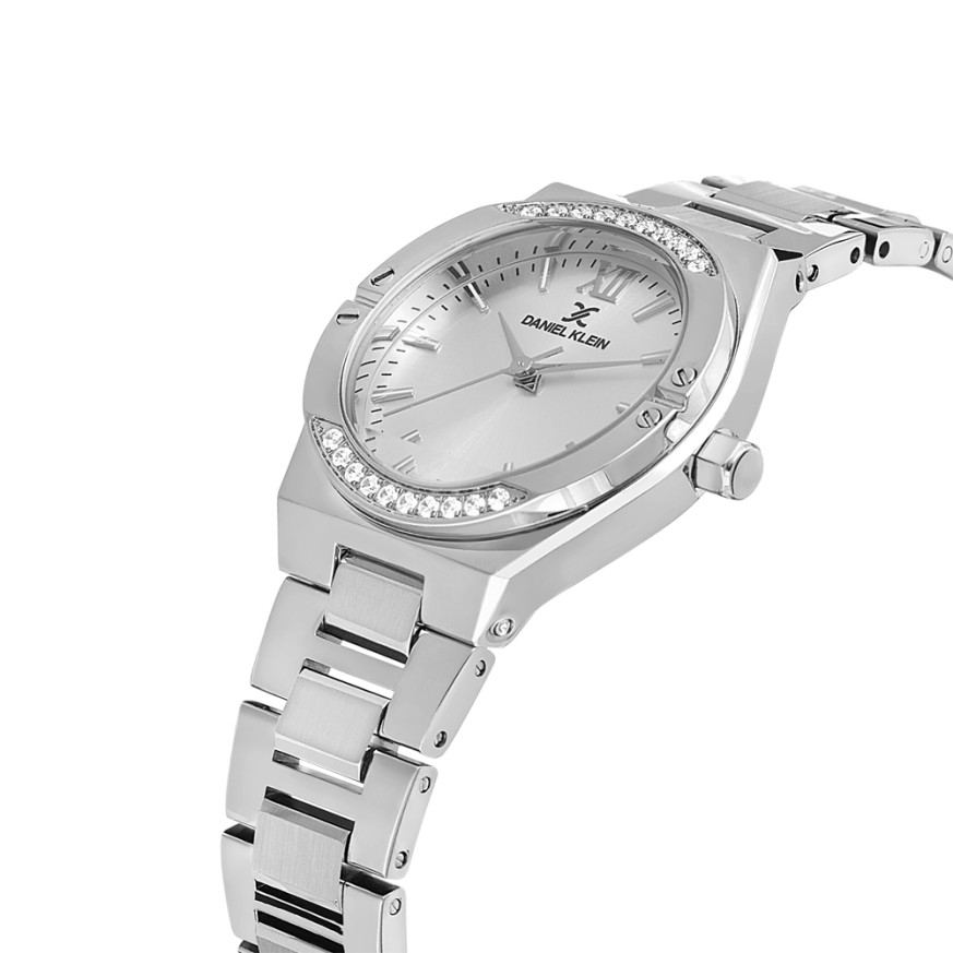 Красив дамски часовник Daniel Klein с модерна визия от колекцията Premium. Сребрист аналогов дисплей със семпъл дизайн. Декорация от бляскави кристали. Стъкло минерал-кристал. Корпус изработен от метал. Верижка от неръждаема стомана. Диаметър на корпуса 32 мм. Часовникът се задвижва от кварцов механизъм. Водоустойчивост 3 ATM - допускат се леки пръски, не се препоръчва обилно мокрене.
