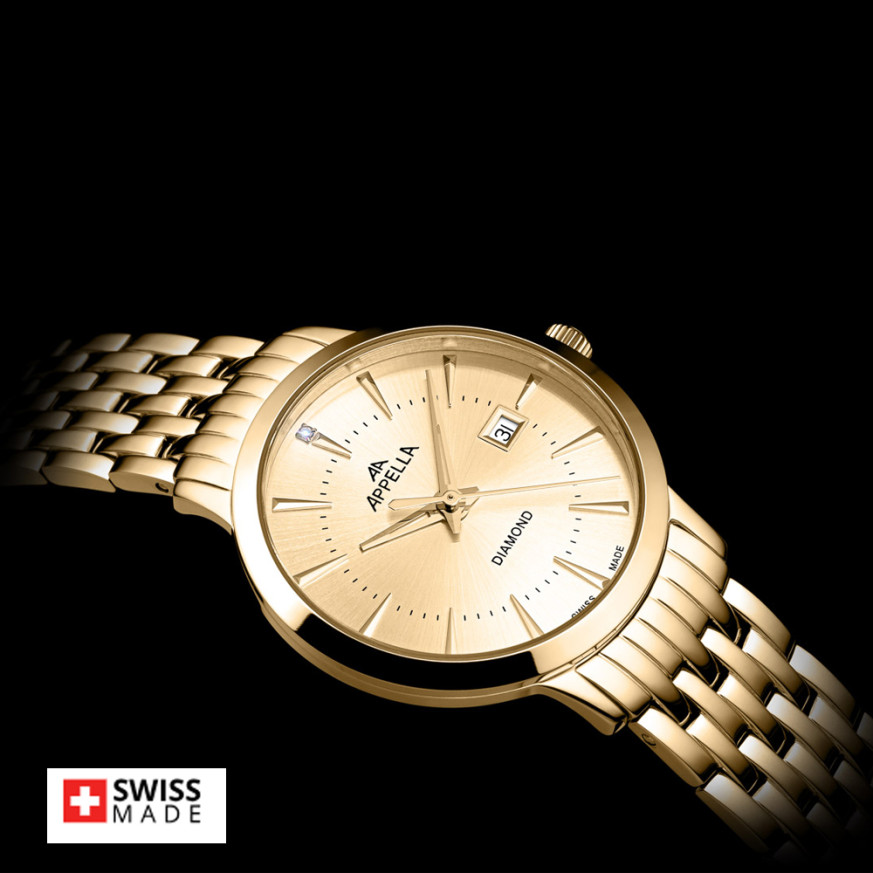 Часовник Appella L32003.1191DQ – изискан дамски модел, който впечатлява с елегантен златист циферблат, украсен с нежен диамант и индикатор за дата. Корпусът и верижката от благородна стомана придават усещане за лукс и устойчивост, а сапфир-кристалът предпазва от надраскване. Задвижван от високоточен швейцарски кварцов механизъм ETA F04 / RONDA 785 Swiss Made, този часовник съчетава фин дизайн и надеждна функционалност – идеален избор за модерната жена с вкус към класиката.