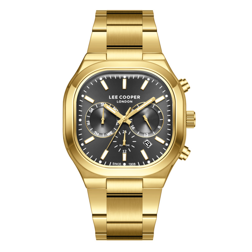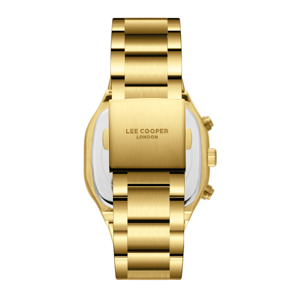 Впечатляващ модел часовник Lee Cooper със спортно-елегантен дизайн. Черен мултифункционален дисплей с показатели за дата, ден от седмицата, 24-часов формат и двойно време. Луминесцентно покритие върху стрелките и индексите. Стъкло минерал-кристал. Корпус от супер метал - специална сплав, създадена от марката. Верижка от неръждаема стомана в златист цвят. Задвижва се от кварцов механизъм. Водоустойчивост 5 ATM - допускат се леки пръски и взимане на душ, не се препоръчва обилно мокрене.