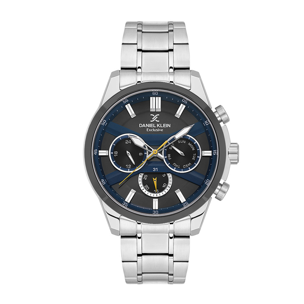 Спортно-елегантен мъжки часовник Daniel Klein от колекцията Exclusive. Моделът е с метален корпус и верижка от неръждаема стомана. Мултифункционален дисплей в черен цвят с показатели за дата, ден от седмицата и 24-часов формат. Луминесцентно покритие върху стрелките и индексите. Стъкло минерал-кристал. Диаметър на корпуса 44 мм. Часовникът се задвижва от кварцов механизъм. Водоустойчивост 5 ATM - допускат се леки пръски и взимане на душ, не се препоръчва обилно мокрене.