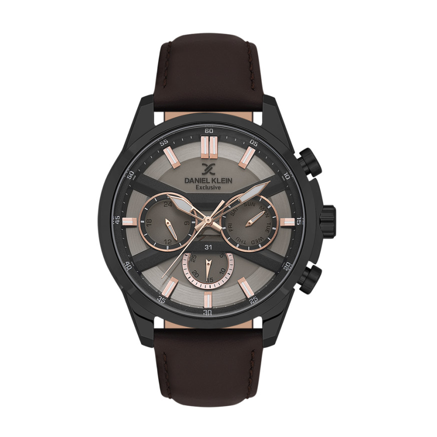 Мъжки часовник Daniel Klein със спортно-елегантен дизайн от колекцията Exclusive. Корпус изработен от метал. Каишка от естствена кожа в тъмнокафяв цвят. Мултифункционален дисплей с показатели за дата, ден от седмицата и 24-часов формат. Луминесцентно покритие върху стрелките и индексите. Стъкло минерал-кристал. Диаметър на корпуса 44 мм. Часовникът се задвижва от кварцов механизъм. Водоустойчивост 5 ATM - допускат се леки пръски и взимане на душ, не се препоръчва обилно мокрене.