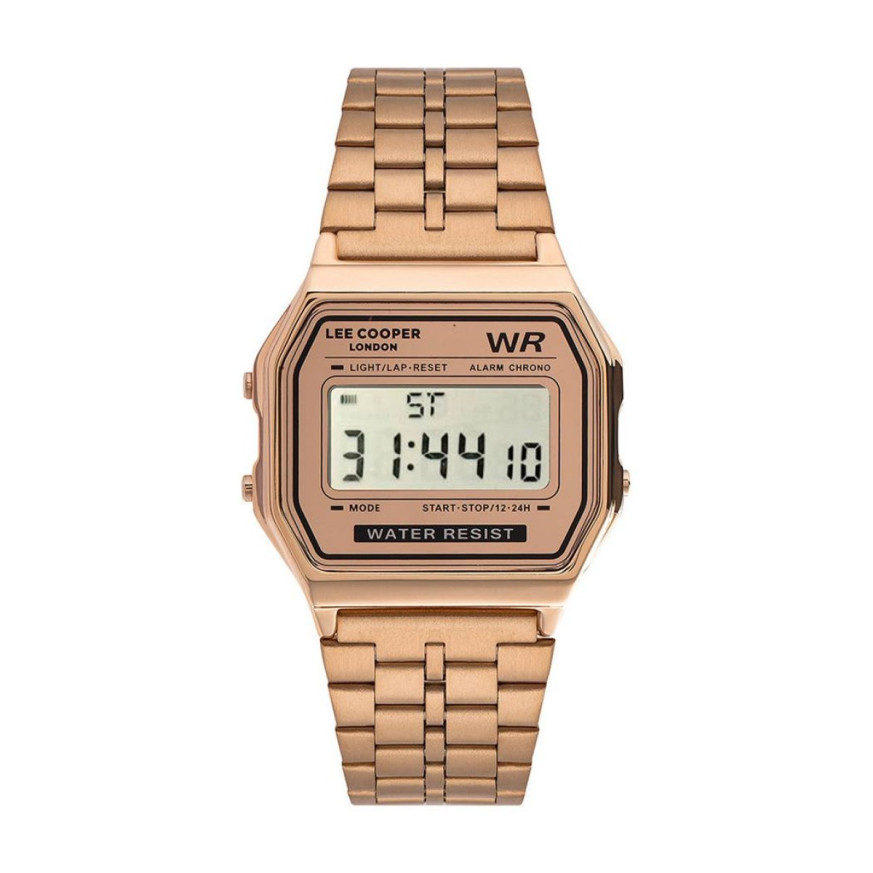 Класически модел часовник Lee Cooper със спортен дизайн, подходящ както за мъже, така и за жени. Корпус изработен от супер метал - специална сплав, създадена от марката. Верижка от неръждаема стомана в цвят розово злато. Дигитален дисплей. Стъкло минерал-кристал. Задвижва се от кварцов механизъм. Водоустойчивост 3 ATM - допускат се леки пръски, не се препоръчва обилно мокрене.