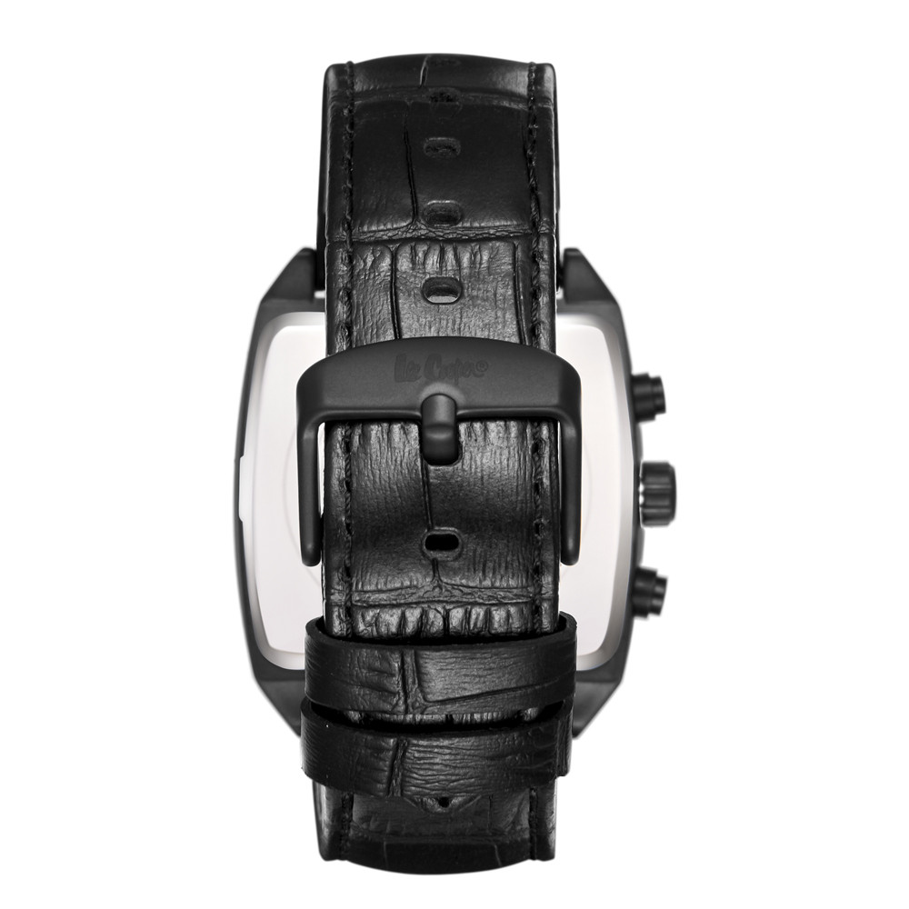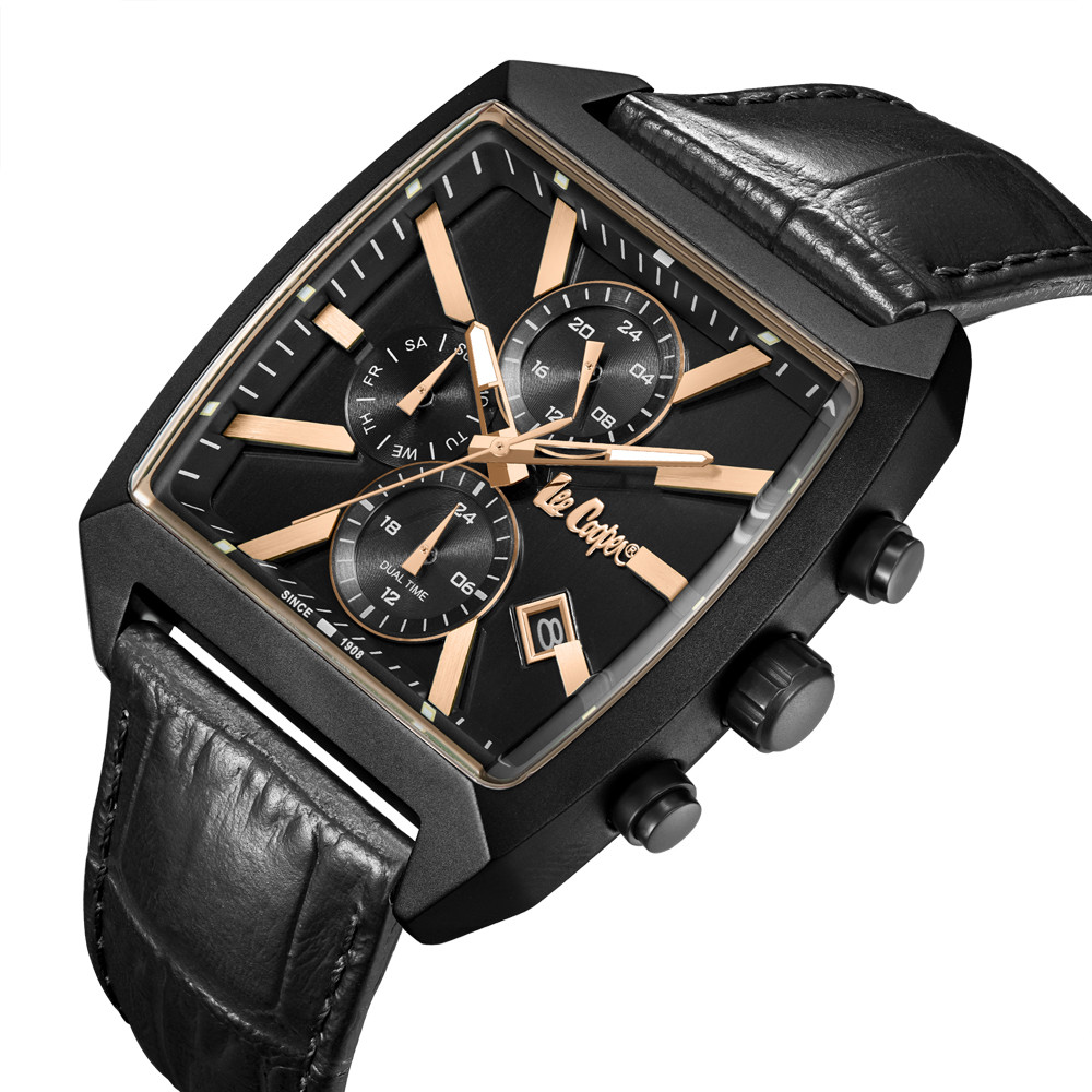 Стилен мъжки часовник Lee Cooper. Черен мултифункционален дисплей с детайли в цвят розово злато, показатели за дата, ден от седмицата, 24-часов формат и двойно време. Стъкло минерал-кристал. Корпус от супер метал - специална сплав, създадена от марката. Черна каишка от естествена кожа. Задвижва се от кварцов механизъм. Водоустойчивост 5 ATM - допускат се леки пръски и взимане на душ, не се препоръчва обилно мокрене.