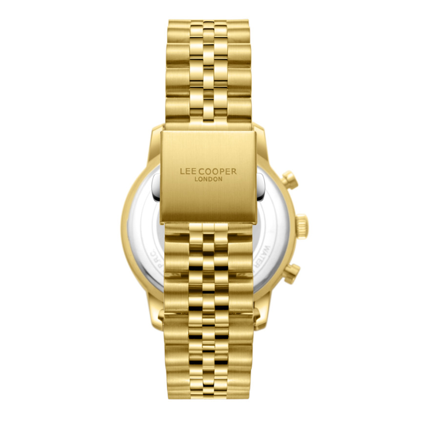 Мъжки часовник Lee Cooper със спортно-елегантен дизайн. Сребрист мултифункционален дисплей със златисти детайли. Луминесцентно покритие върху стрелките. Стъкло минерал-кристал. Корпус от супер метал - специална сплав, създадена от марката. Верижка изработена от неръждаема стомана. Диаметър на корпуса 43 мм. Задвижва се от кварцов механизъм. Водоустойчивост 3 ATM - допускат се леки пръски, не се препоръчва обилно мокрене.