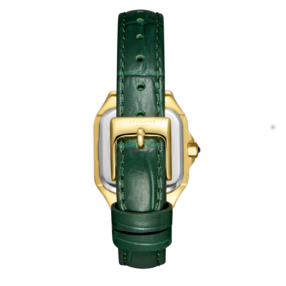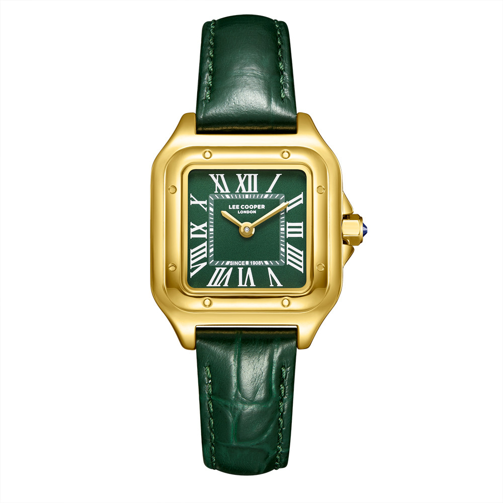 Класически модел дамски часовник Lee Cooper със стилен дизайн. Аналогов дисплей в тъмнозелен цвят със златисти стрелки и бели римски цифри. Стъкло минерал-кристал. Корпус изработен от супер метал - специална сплав, създадена от марката. Каишка от естествена кожа. Задвижва се от кварцов механизъм. Водоустойчивост 3 ATM - допускат се леки пръски, не се препоръчва обилно мокрене.