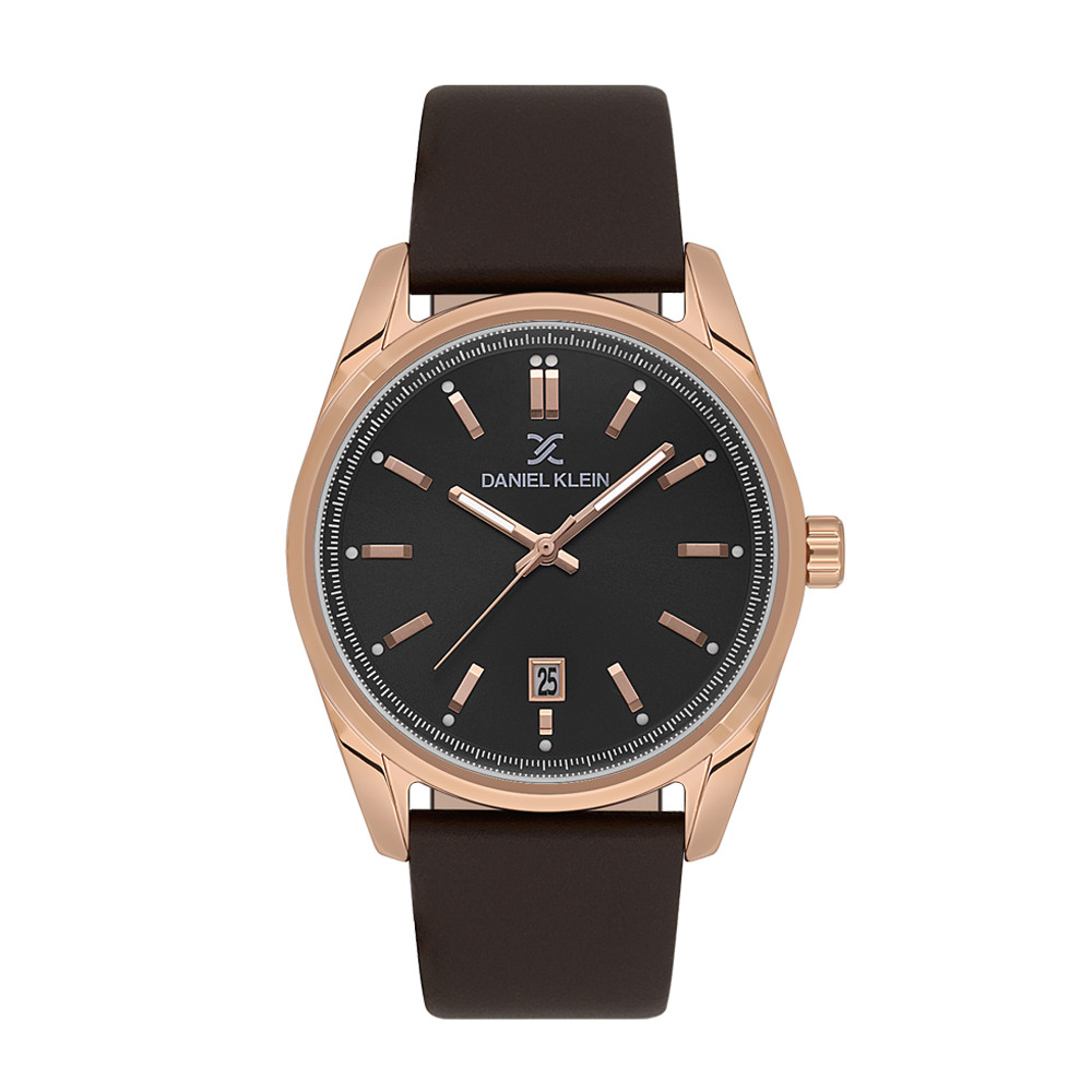 Стилен мъжки часовник Daniel Klein от колекцията Premium. Аналогов дисплей в черен цвят със семпъл дизайн и показател за дата. Корпус изработен от метал. Тъмнокафява каишка от естествена кожа. Стъкло минерал-кристал. Диаметър на корпуса 42 мм. Часовникът се задвижва от кварцов механизъм. Водоустойчивост 5 ATM - допускат се леки пръски и взимане на душ, не се препоръчва обилно мокрене.