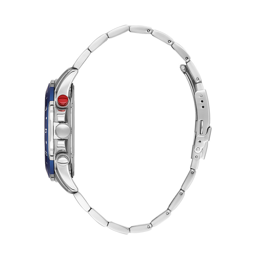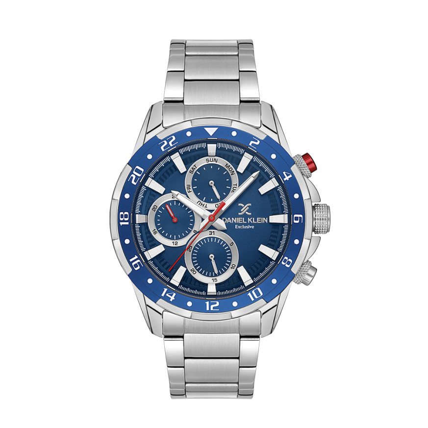 Мъжки часовник Daniel Klein със спортно-ежедневен дизайн от колекцията Exclusive. Син мултифункционален дисплей със сребристи детайли. Стъкло минерал-кристал. Метален корпус в  комбинация с верижка от неръждаема стомана. Задвижва от кварцов механизъм. Водоустойчивост 5 ATM - допускат се леки пръски и взимане на душ, не се препоръчва обилно мокрене.