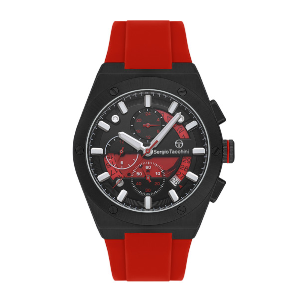 Мъжки часовник Sergio Tacchini със спортно-ежедневен дизайн от колекцията Archivio. Моделът е с мултифункционален дисплей и стъкло минерал-кристал. Корпус изработен от неръждаема стомана.Червена силиконова каишка. Диаметър на корпуса 44 мм. Задвижва се от кварцов механизъм. Водоустойчивост 5 ATM - допускат се леки пръски и взимане на душ, не се препоръчва обилно мокрене.