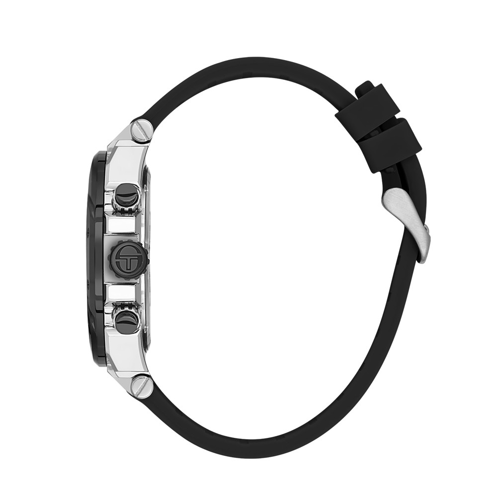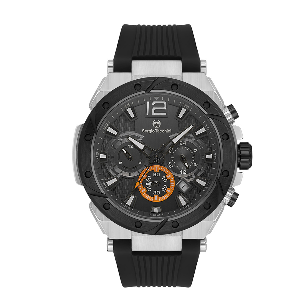 Страхотен модел мъжки часовник Sergio Tacchini със спортна визия от колекцията Heritech. Корпус от неръждаема стомана съчетан със силиконова каишка. Мултифункционален дисплей с впечатляващ дизайн. Луминесцентно покритие върху стрелките и индексите. Стъкло минерал-кристал. Диаметър на корпуса 46 мм.Часовникът се задвижва от кварцов механизъм. Водоустойчивост 10 ATM - позволява мокрене, къпане и плуване във водни басейни.