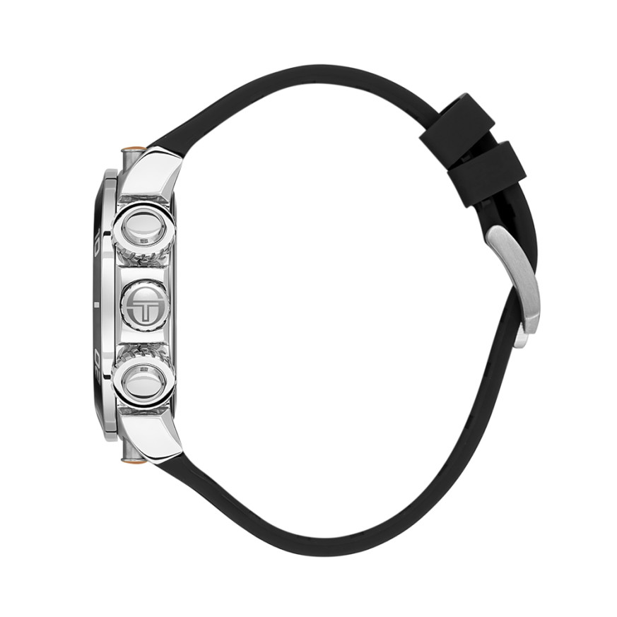 Мъжки часовник Sergio Tacchini с модерна спортна визия от колекцията Heritech. Корпус от неръждаема стомана съчетан със силиконова каишка. Мултифункционален дисплей с интересен дизайн. Луминесцентно покритие върху стрелките и индексите. Стъкло минерал-кристал. Диаметър на корпуса 47 мм. Часовникът се задвижва от кварцов механизъм. Водоустойчивост 10 ATM - позволява мокрене, къпане и плуване във водни басейни.