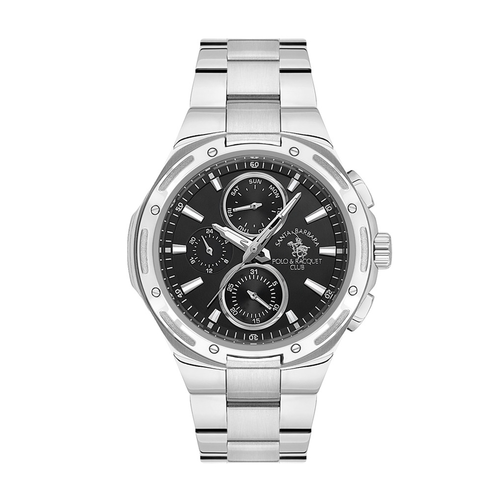 Мъжки часовник Santa Barbara Polo & Racquet Club със спортно-елегантен дизайн от колекцията Prive. Мултифункционален дисплей с показатели за дата, ден от седмицата и 24-часов формат. Луминесцентно покритие върху стрелките и индексите. Корпус и верижка изработени от неръждаема стомана. Диаметър на корпуса 44 мм. Стъкло минерал-кристал. Задвижва се от кварцов механизъм с калибър VX9NE. Водоустойчивост 5 ATM - допускат се леки пръски и взимане на душ, не се препоръчва обилно мокрене.