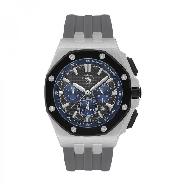 Мъжки часовник Santa Barbara Polo & Racquet Club със спортно-елегантен дизайн от колекцията Prive. Сив дисплей хронограф с детайли в цвят син и сребрист.. Луминисцентно покритие на стрелките и индексите. Стъкло минерал-кристал. Корпус от неръждаема стомана в комбинация със силиконова каишка. Диаметър на корпуса 44.8 мм. Задвижва се от кварцов механизъм с калибър VD53C14. Водоустойчивост 5 ATM - допускат се леки пръски и взимане на душ, не се препоръчва обилно мокрене.