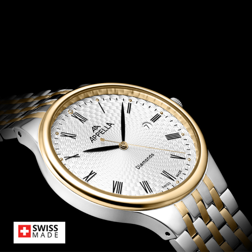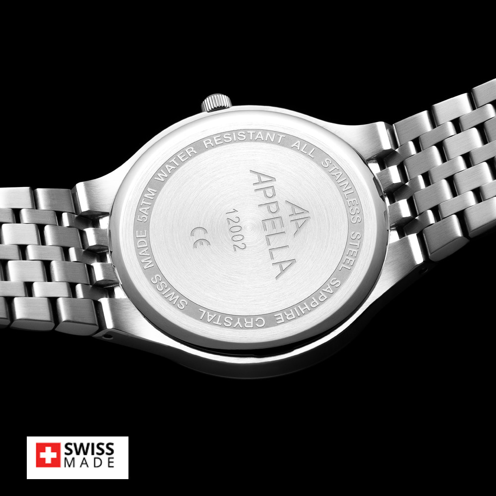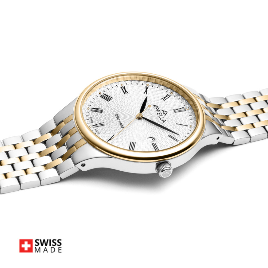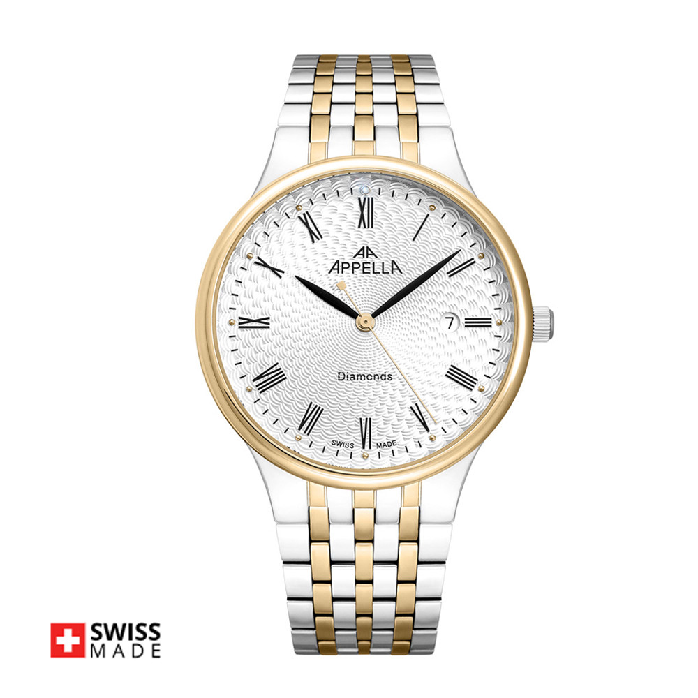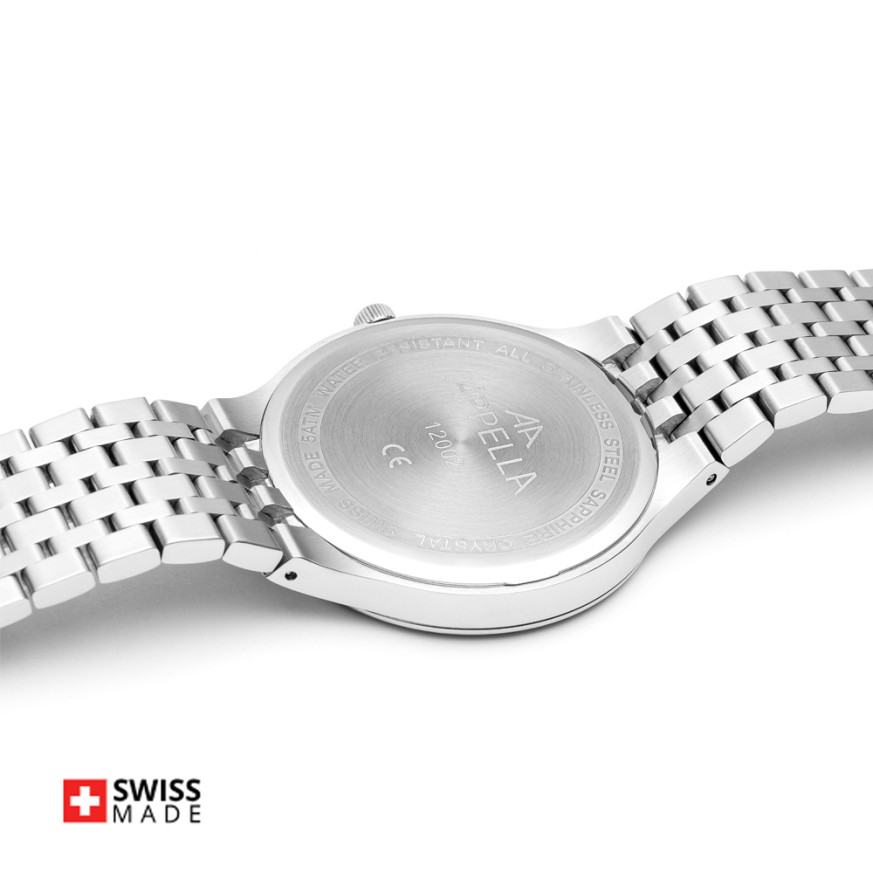 Мъжки часовник Appella L12002.2133DQ е изискана комбинация от функционалност и стил. Корпус и елегантна верижка от неръждаема стомана. Стъкло сапфир-кристал. Сребрист циферблат декориран с един диамант и допълнен от показател за дата. Задвижва се от кварцов механизъм Eta F06 Swiss Made. Диаметър на корпуса 41 мм. Водоустойчивост 5 ATM - допускат се леки пръски и взимане на душ, не се препоръчва обилно мокрене.