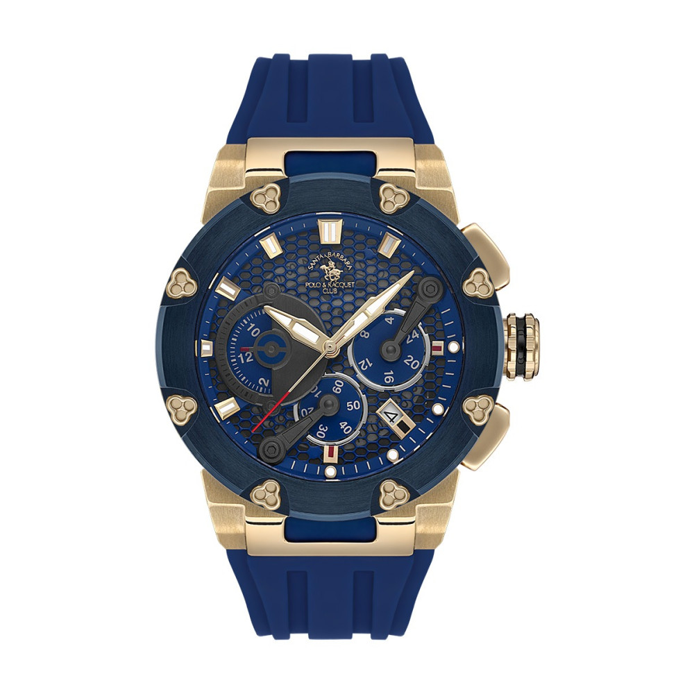 Впечатляващ модел мъжки часовник Santa Barbara Polo & Racquet Club със спортен дизайн от колекцията Prive. Дисплей хронограф в син цвят със златисти детайли. Луминесцентно покритие на стрелките и индексите. Корпус изработен от неръждаема стомана в комбинация със силиконова каишка. Стъкло минерал-кристал. Задвижва се от кварцов механизъм с калибър VD33-4.0. Диаметър на корпуса 45 мм. Водоустойчивост 10 ATM - позволява мокрене, къпане и плуване във водни басейни.